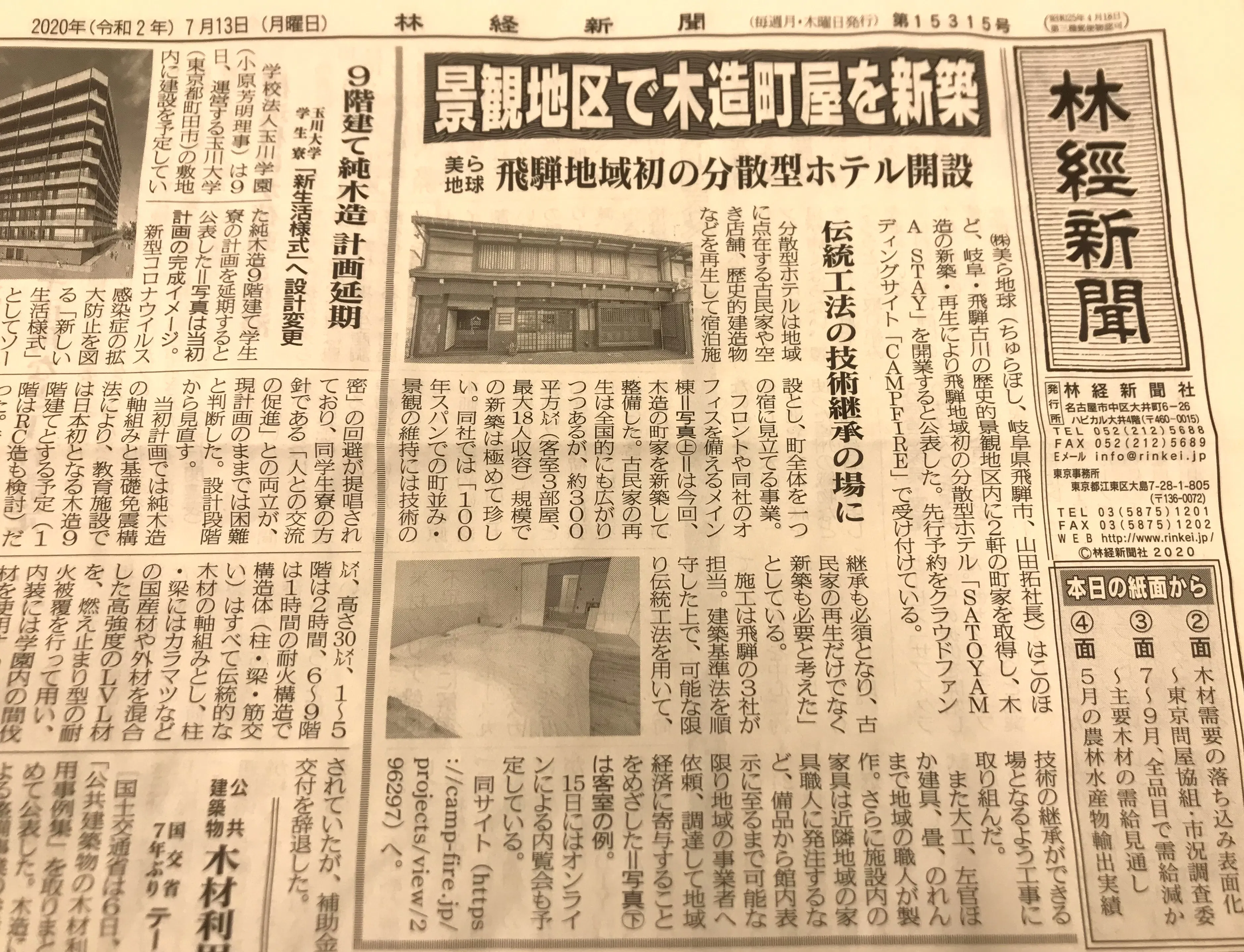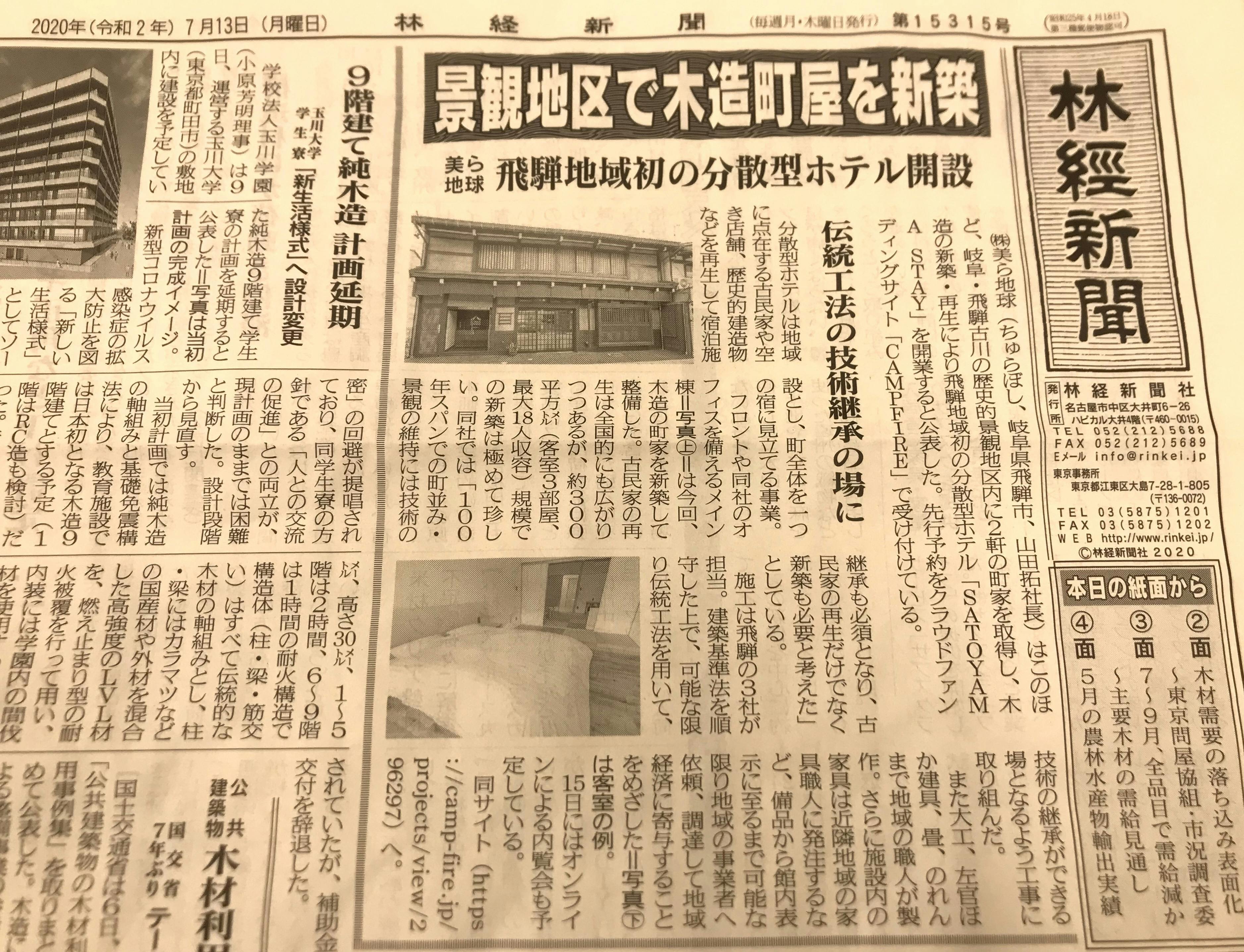 先週、クラウドファンディングを開始と同時に、我々のSATOYAMA STAYの取組みについてプレスリリースを流しましたが、紙面掲載第一号が出てまいりました〜。