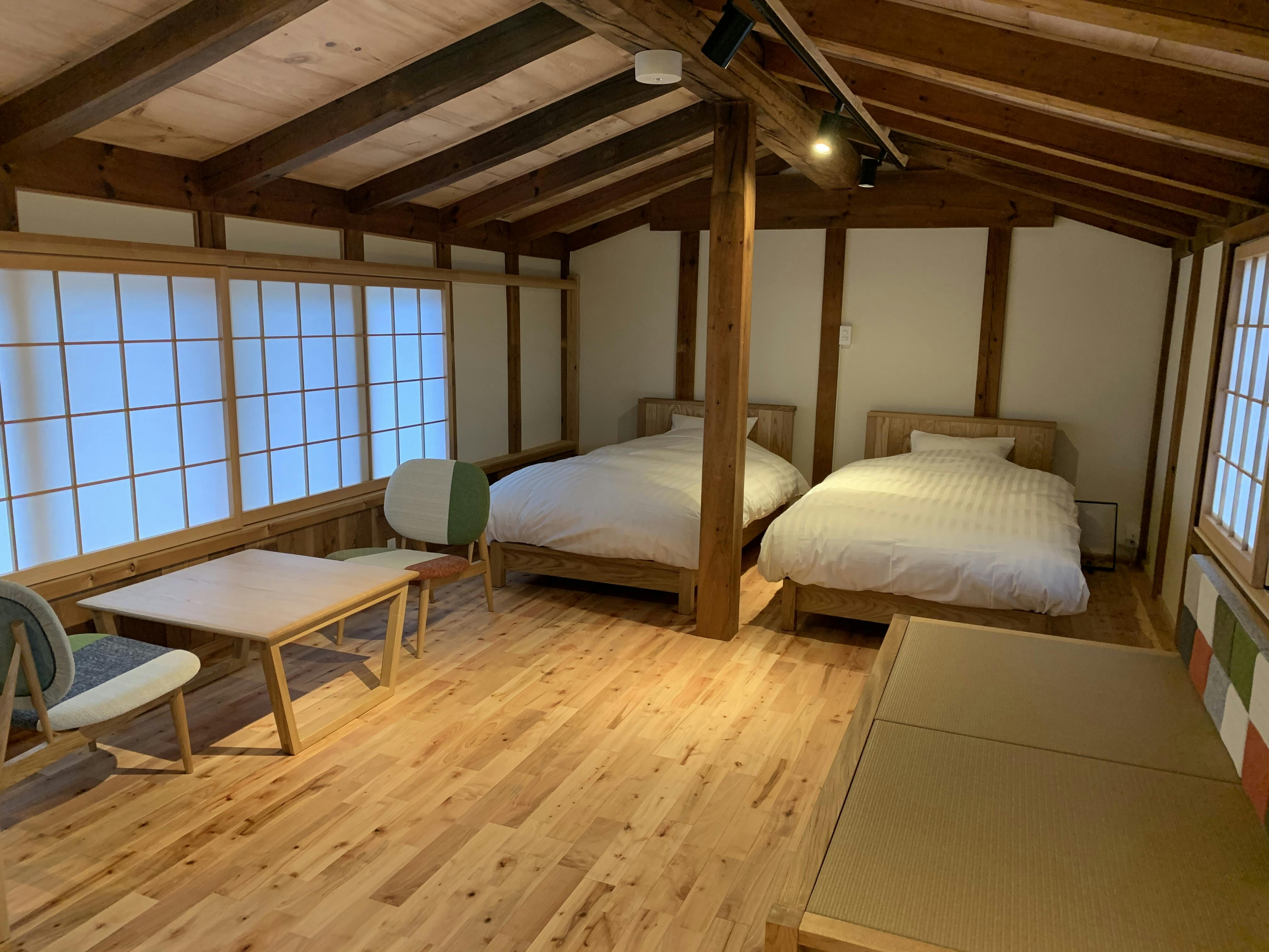 2つのベッドだけでなく、畳ソファーベッドや敷布団も用意してあるので最大5名までKURA一棟貸し切りの滞在をお楽しみいただけます。