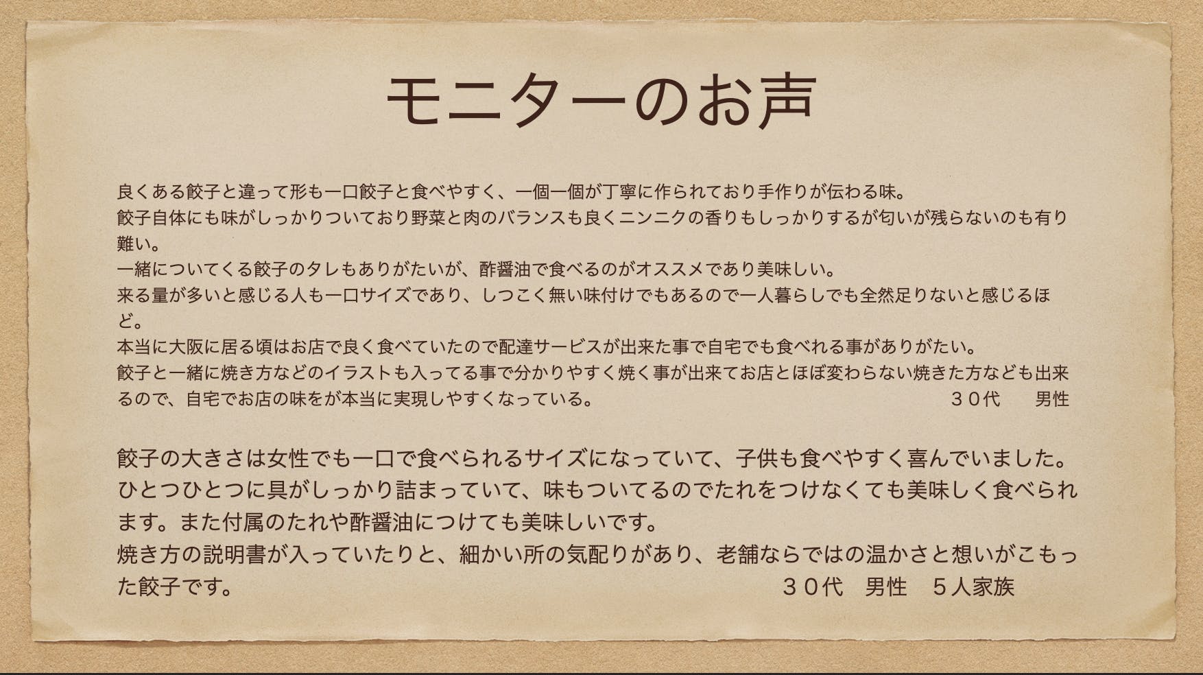 です。そこでピネ亭はチャレンジをしていくことにしました。従来のお店にご来店いただく形ではなく、各家庭の食卓においしい餃子をお届けし子どもさんからご年配の方々までおいしくお召し上がりいただける形にしていくことにしました。