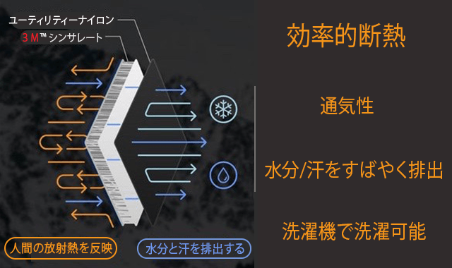 3Mのテクノロジーを使用し、高い防風性と防雨性、さらに通気性を実現、全身に温もりを感じる暖かさを実現しました。