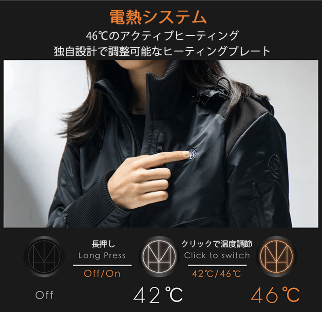 ヒートシステムはジャケットの背面と、前面に2箇所、合計3箇所に搭載されており、位置をボタンで上下できる仕組みになっています。