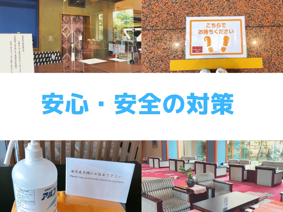 私たち旅館が今、できる事は、お客様の自粛で疲れた心や体を「安心・安全」な体制で癒すことだと思います。館内の消毒の徹底、フロントカウンターにパネルの設置、チェックイン時のソーシャルディスタンスの確保、従業員の体調管理などを徹底して行っております。