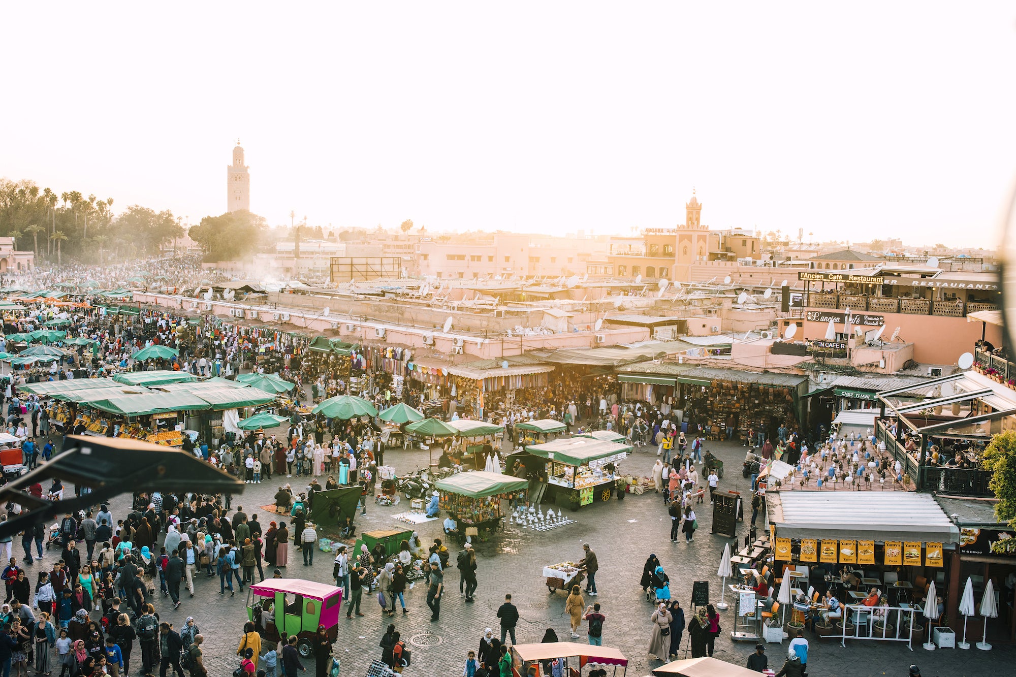 大道芸人が集い、多くの屋台が立ち並ぶマラケシュの『ジャマ・エル・フナ』広場