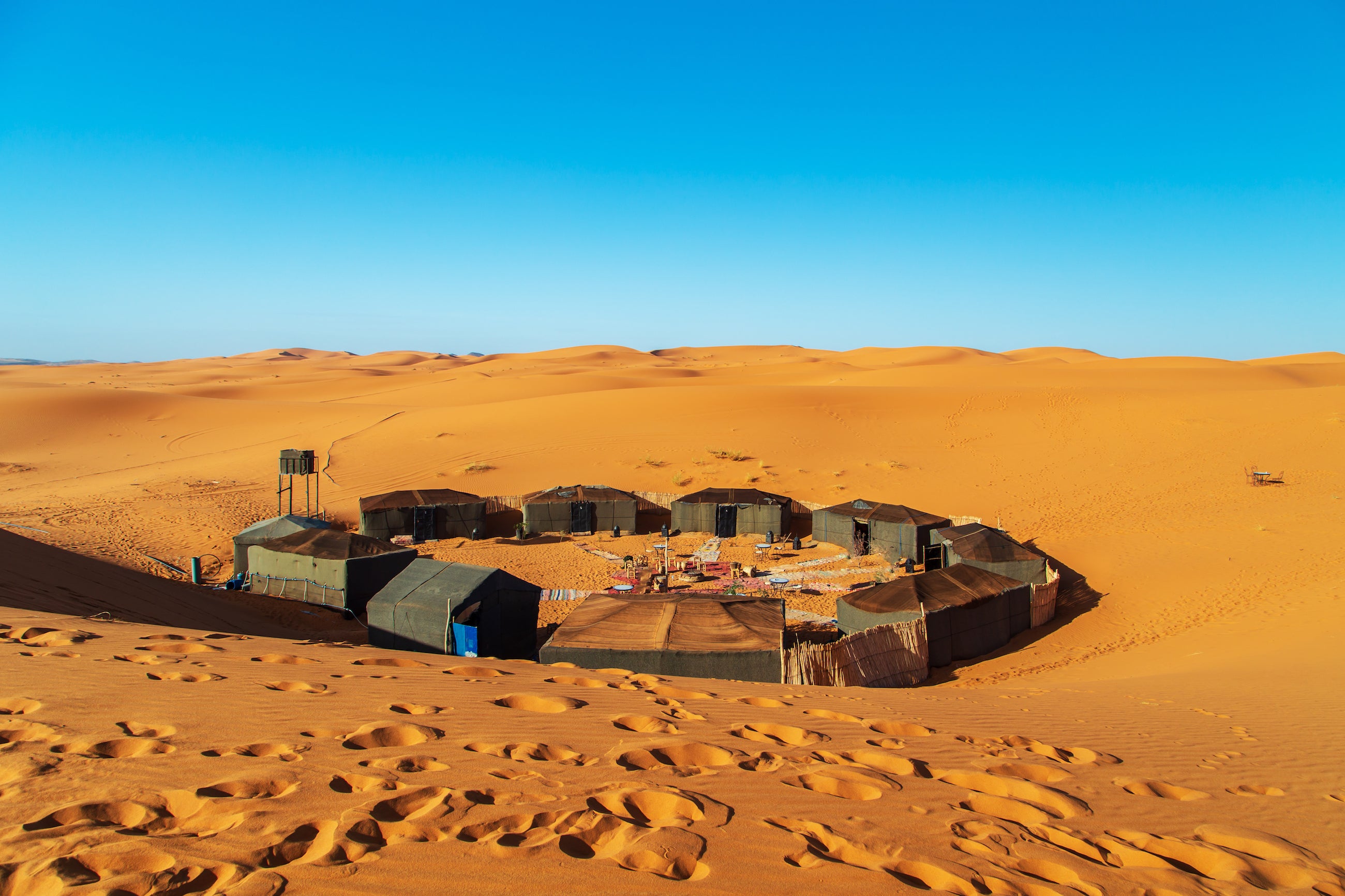 夕方 、ラクダに乗って出発。 雄大な砂の海をゆらゆらと進み、燃えるようなサハラ砂漠のサンセットタイム。キャンプでは、ベルベル人手作りのタジンやスープなどモロッコの伝統料理を囲み、満天の星空を迎える頃にはお散歩したり、寝っ転がって流れ星を数えたり。
