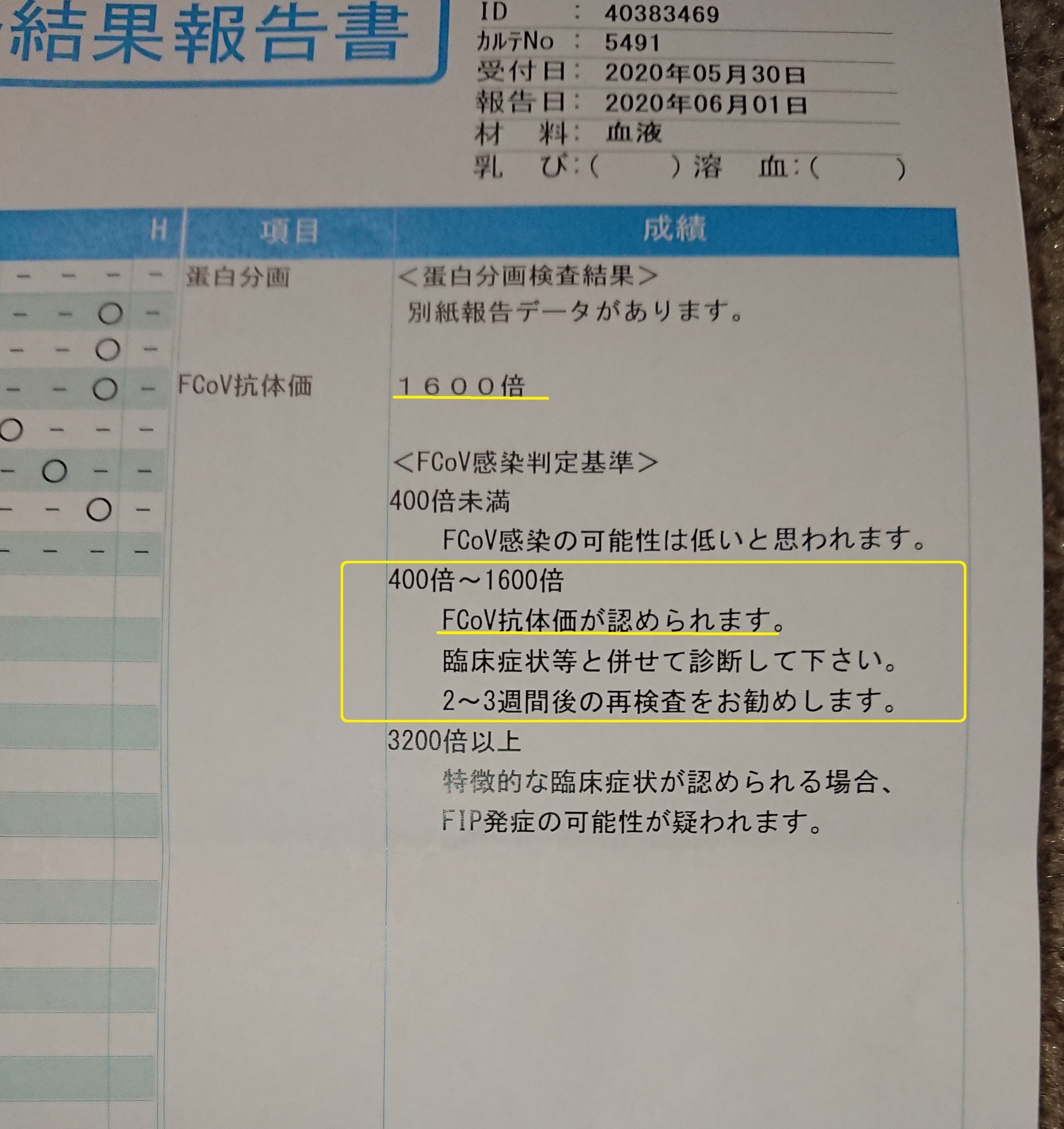 精密検査に向けてほかにもやれる検査を行っておこうとのことで、猫コロナの血液検査を行うことに。ここで初めてコロナウイルスの抗体価が一定値あることがわかりました。(FIPは猫コロナウイルスが特別変異することで患う病気です。)また、FIPの特徴であるグロブリン(タンパク質の一種)が高いというのも、この検査で発覚したのです。ここで初めて獣医さんからもFIPの可能性も考えたほうがいいと言われました。体調不良になって1か月でやっと可能性までたどりついたのです。