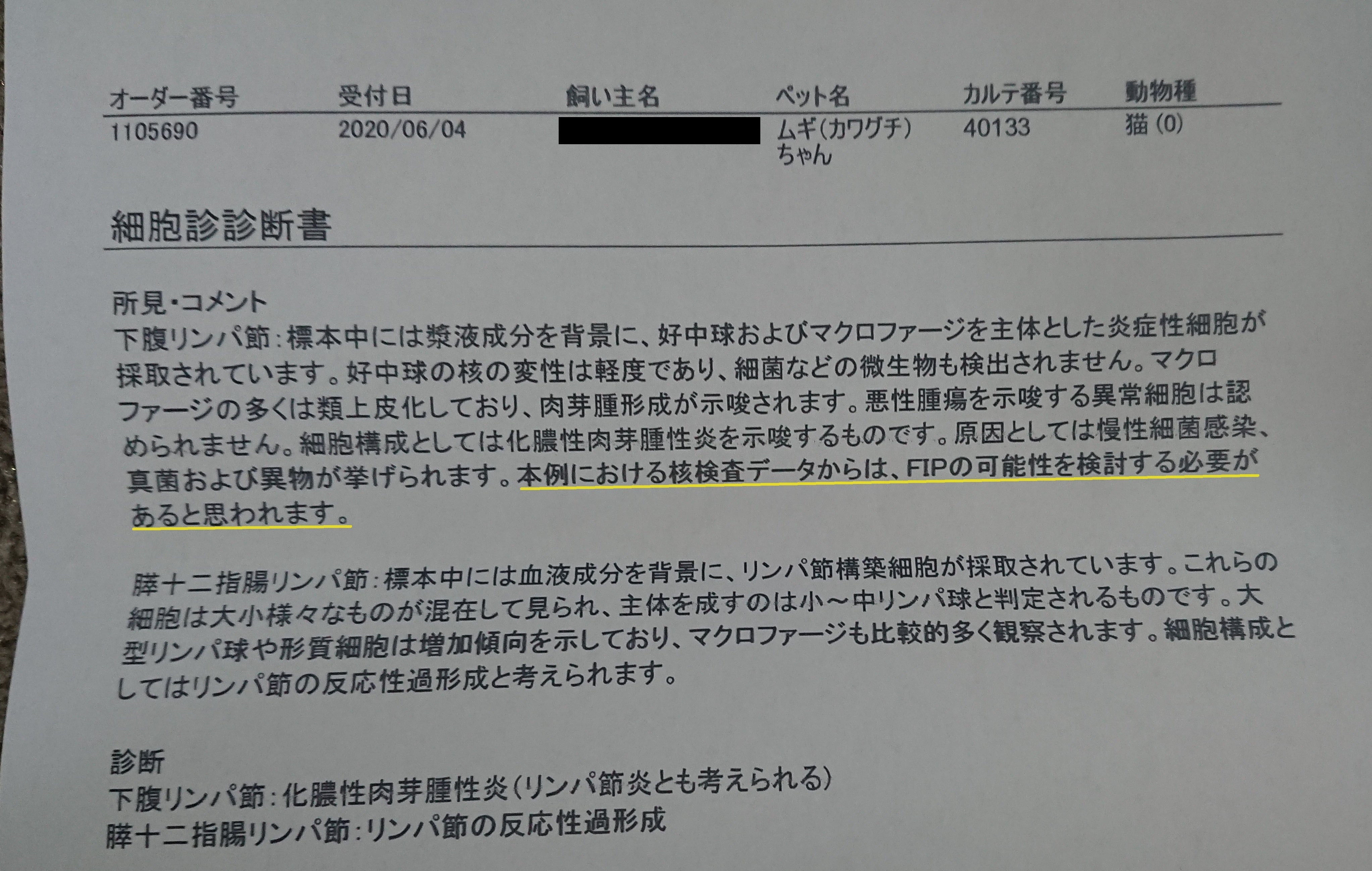 ここから猫伝染性腹膜炎(FIP)であることが判明するまでに、1か月の時間を要することとなりました。