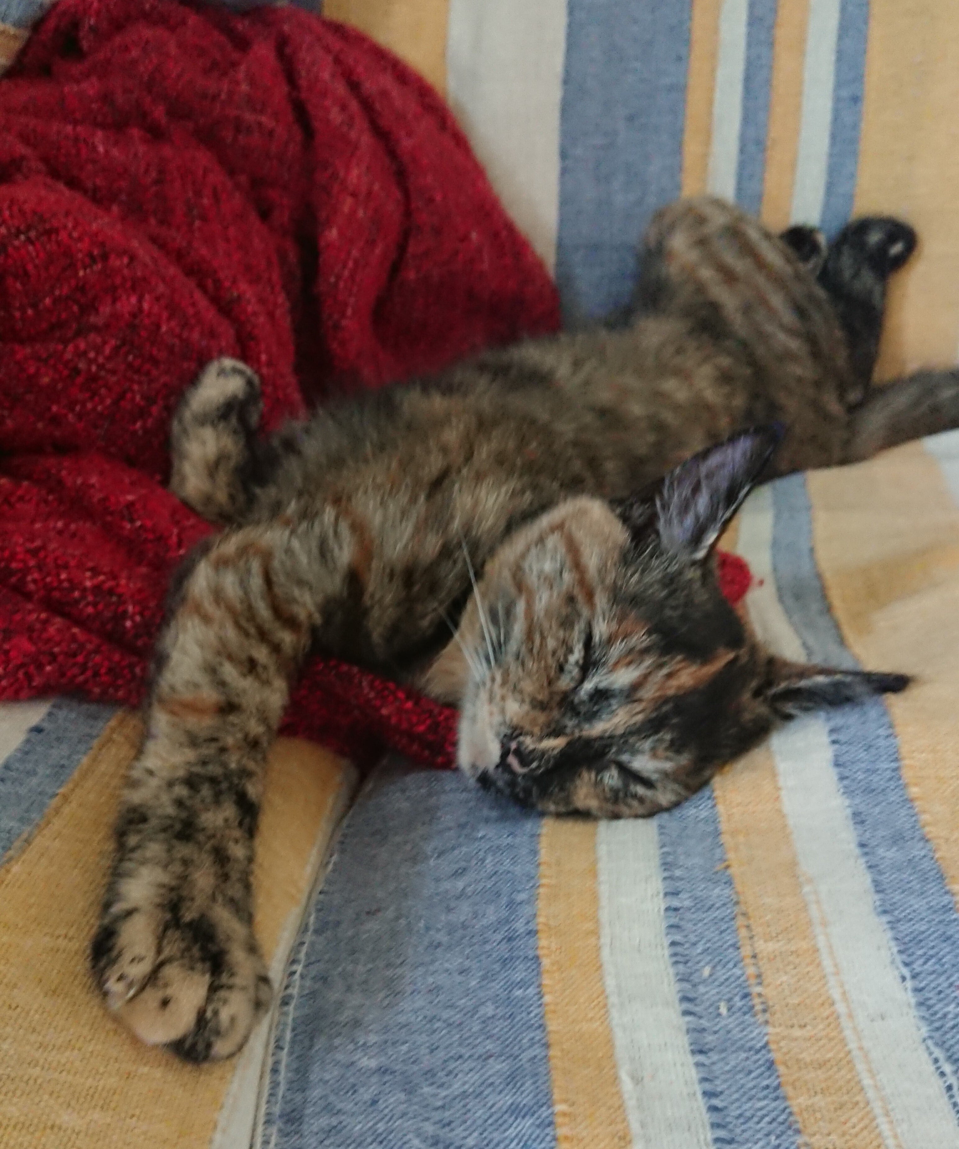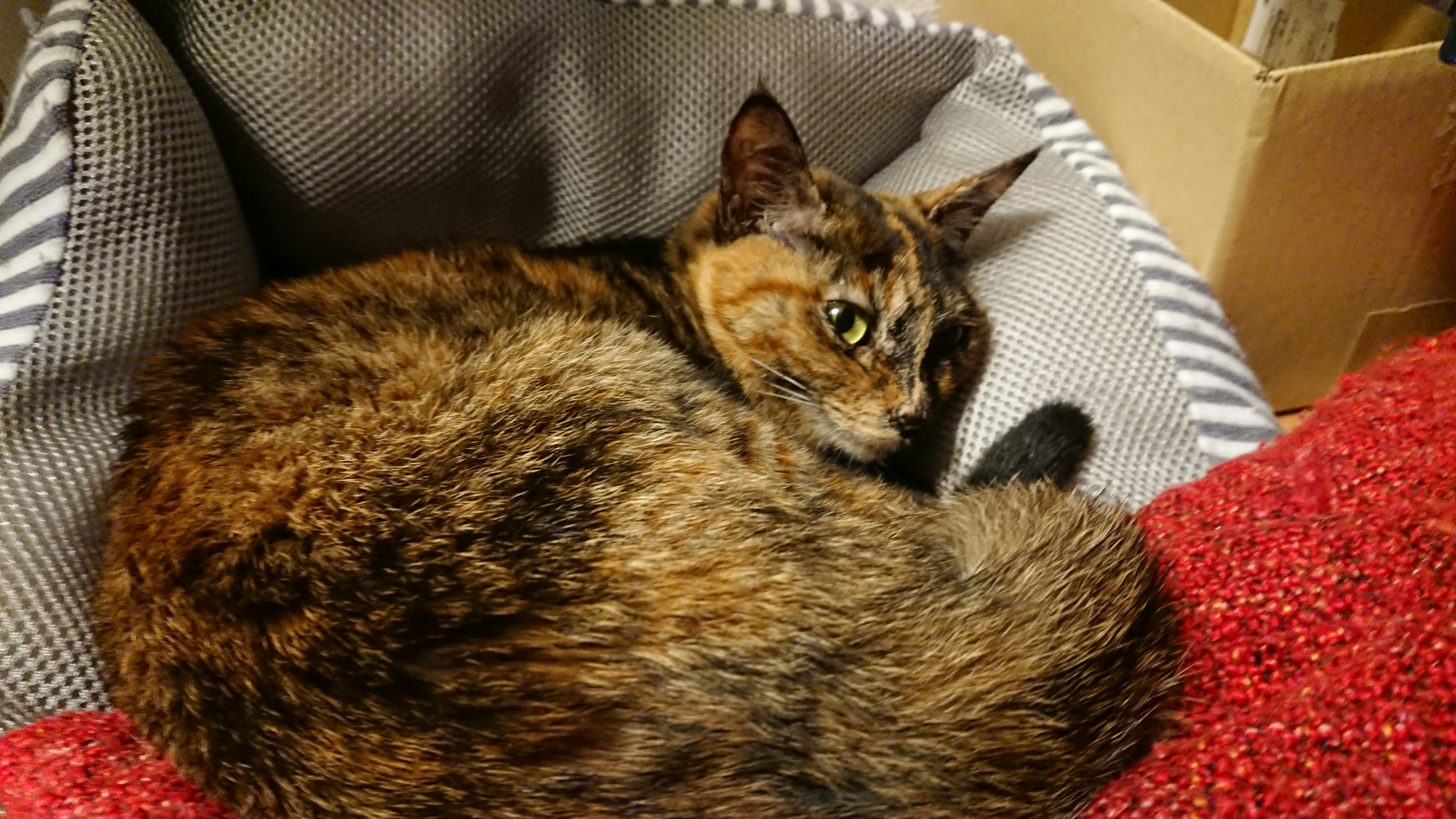 この文章を書いている現在、投薬2日目ですが、驚くほどに状態が改善し始めています。どこかに移動したくても体を起こせなくて、ごろんと横になったままはいつくばって移動していたむぎが、かなりふらふらしていながらも自分の力で歩き出したのです。丸くなって寝ることができなかったのに丸くなって気持ちよさそうに寝息を立てて寝ています。伸びやあくびをするのも10日ぶりぐらいに見ることができ、自分からご飯がほしいとキッチンにいる私の足元に来るようになったのです。こんなすぐに効きはじめるのかという驚きとともに、うれしくて、愛おしくて、泣いてしまいました。この姿を見て、きっとこの薬をちゃんと最後まであげられれば元気になるのではないか、いや絶対元気になると確信じみたものを感じました。投薬1日目。少し楽になったのか丸くなってくつろぐむぎ