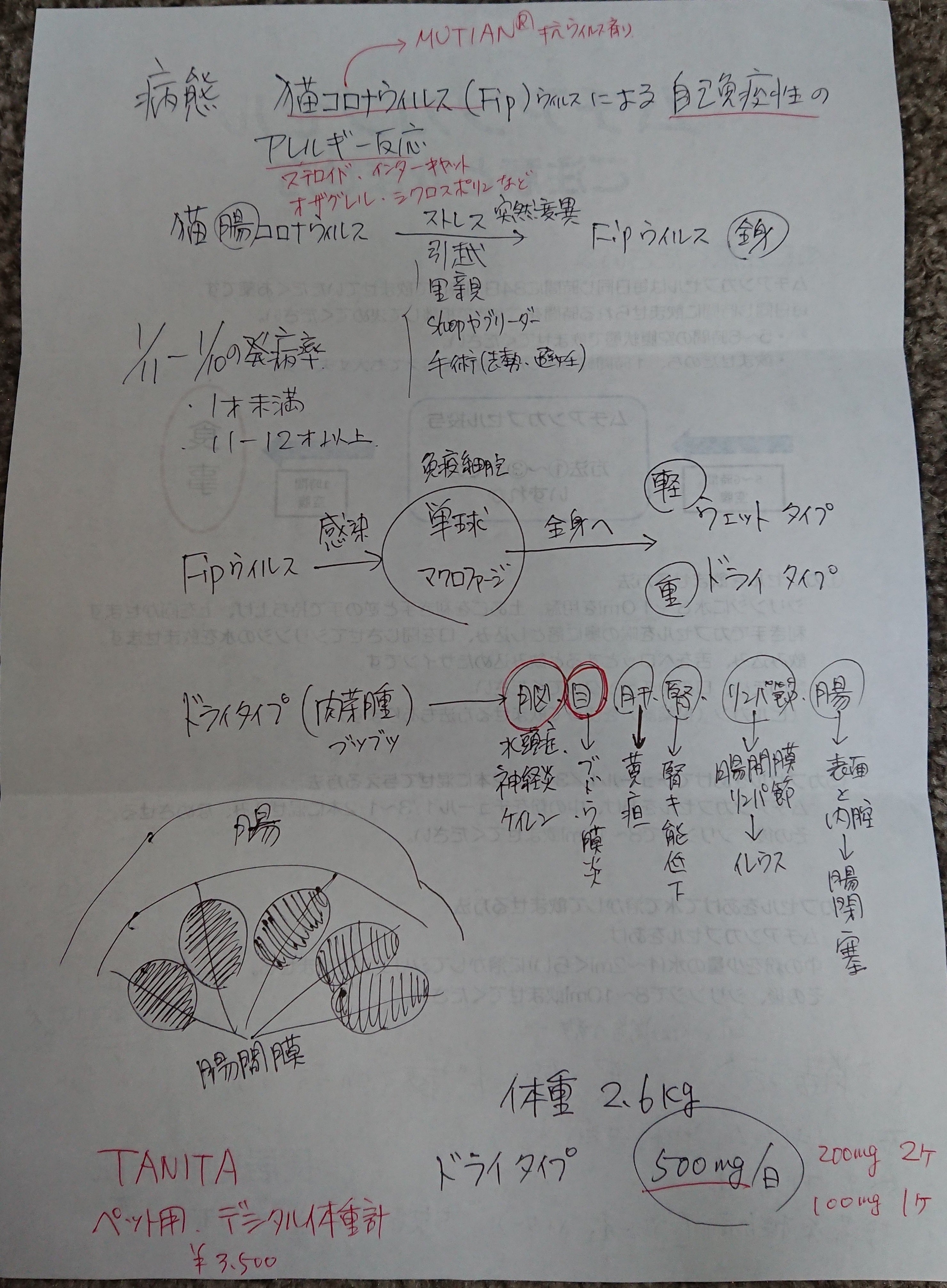 先生が教えてくれたのは「FIPの病態はFIPウイルスによる自己免疫性のアレルギー反応」とのことで、単球マクロファージという免疫細胞にFIPウイルスが感染し全身にまわってしまうようです。