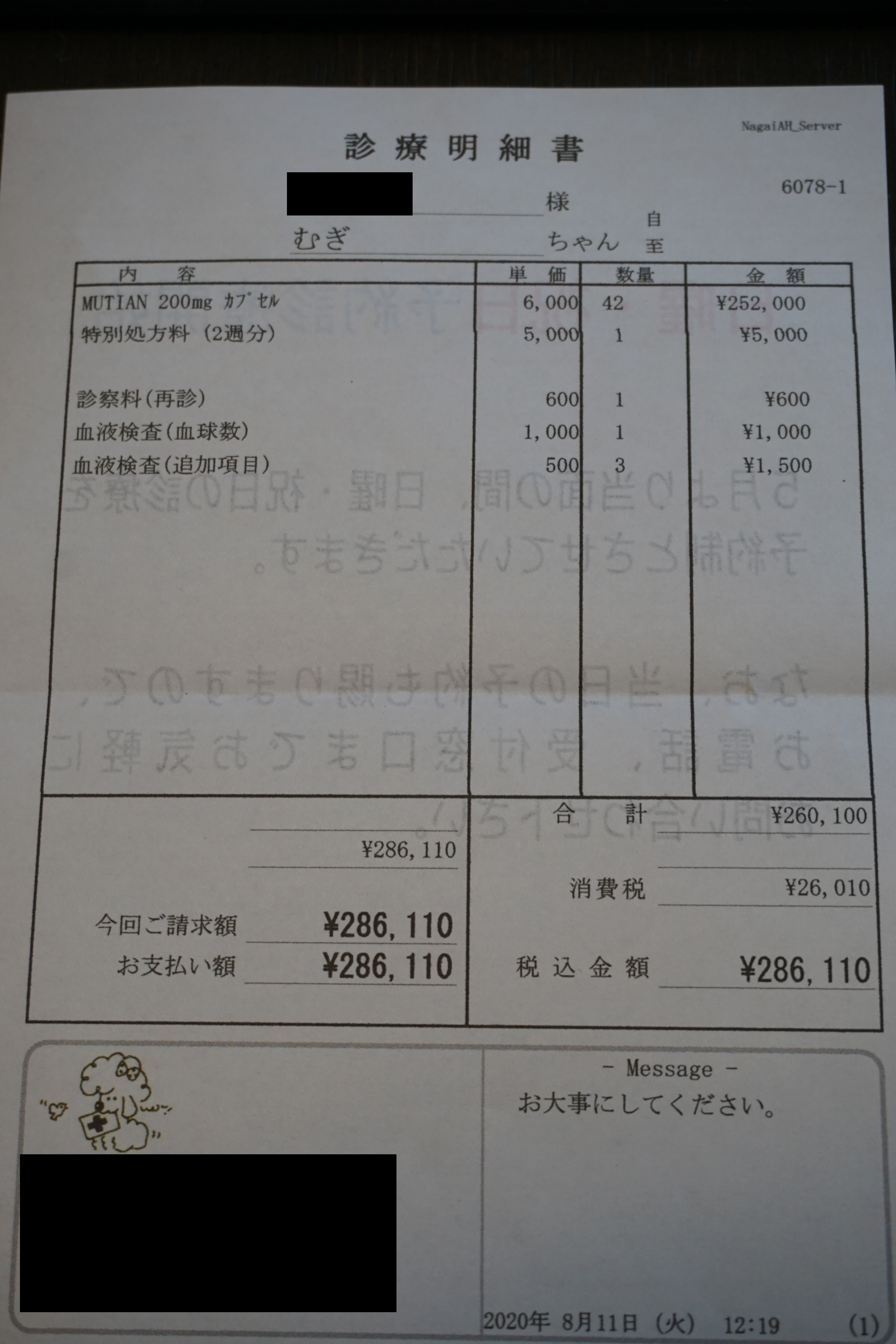 ・8/11 2週間分のお薬と血液検査 ¥286,110