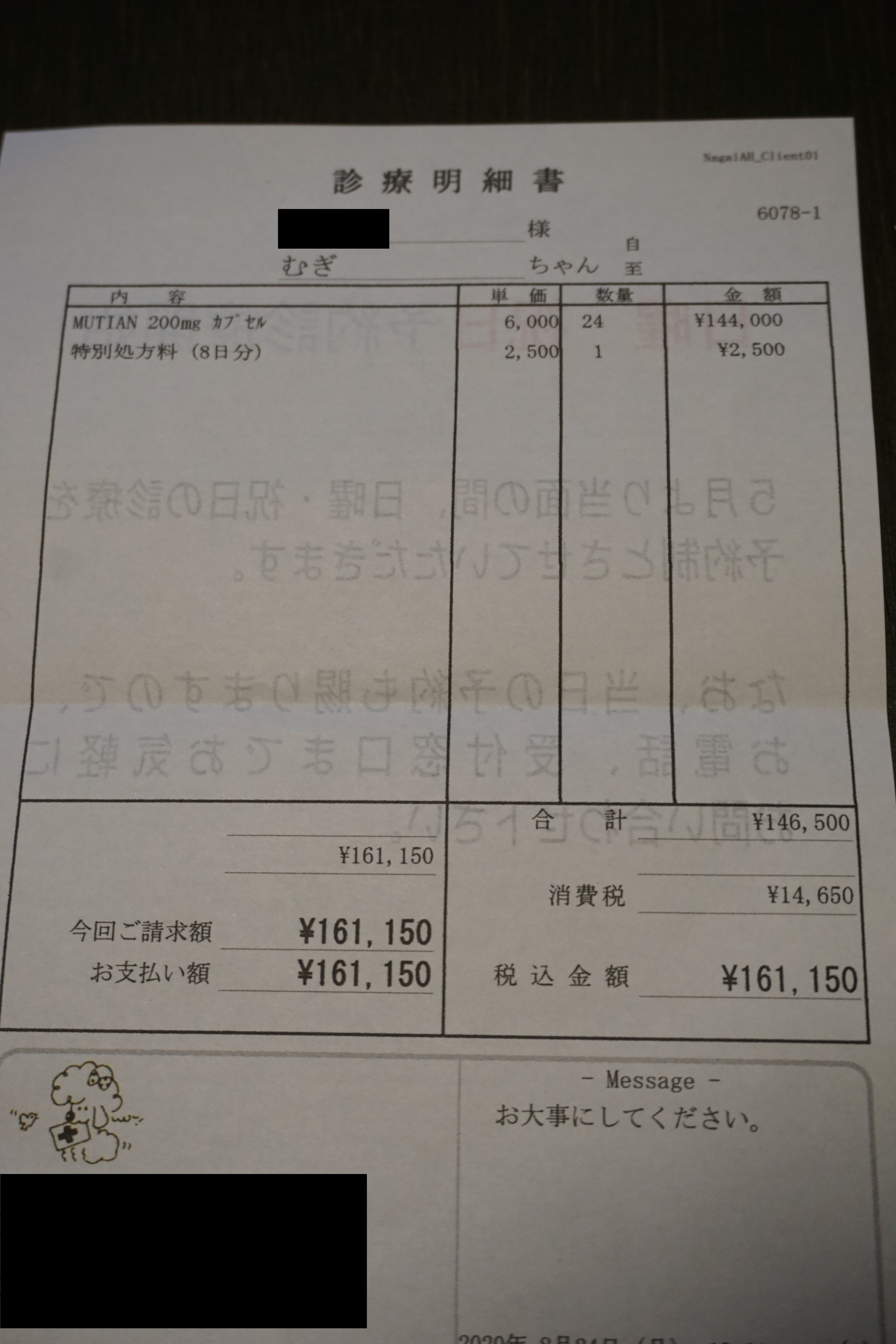 ・8/24 8日分のお薬 ¥161,150