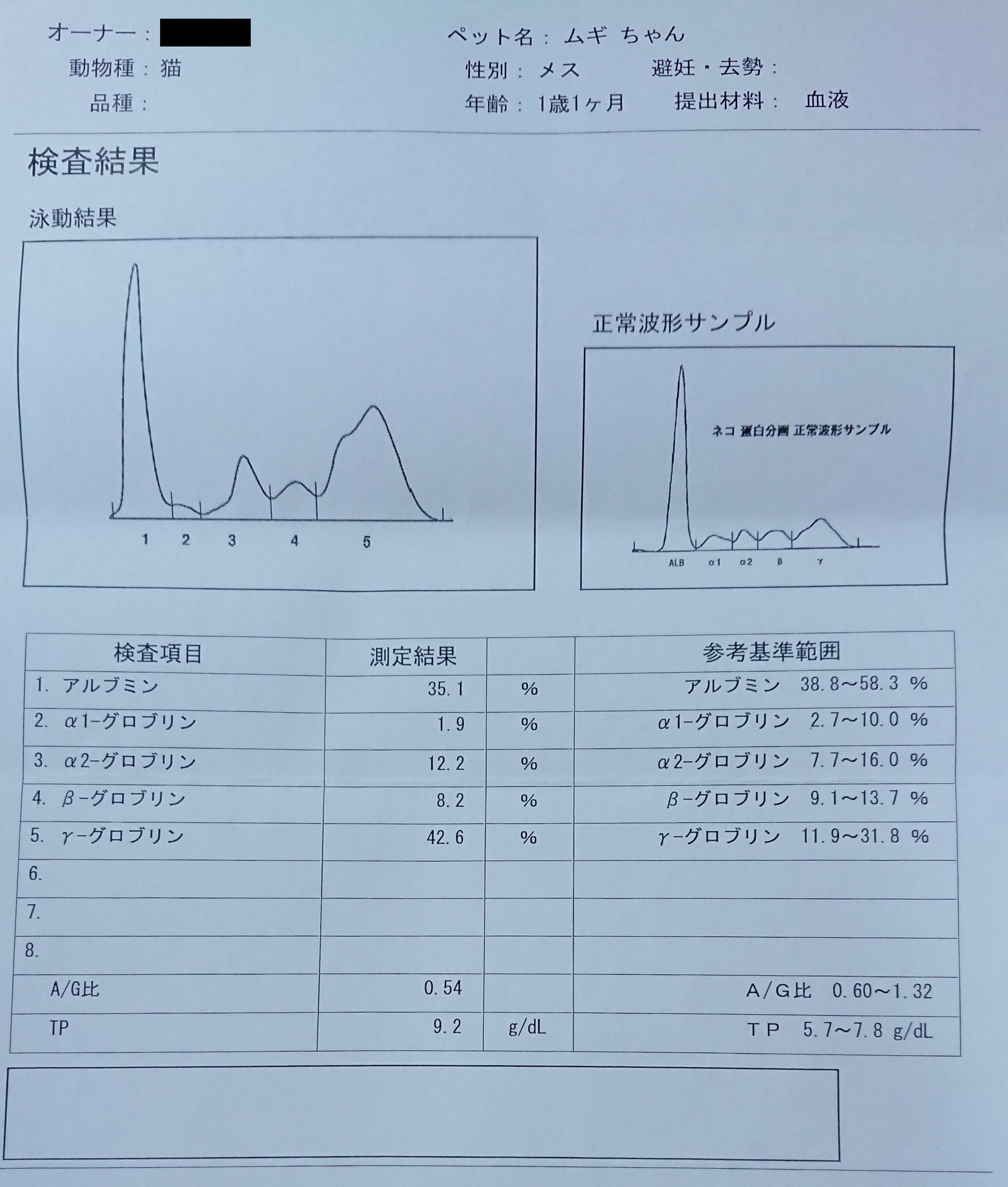 精密検査に向けてほかにもやれる検査を行っておこうとのことで、猫コロナの血液検査を行うことに。ここで初めてコロナウイルスの抗体価が一定値あることがわかりました。(FIPは猫コロナウイルスが特別変異することで患う病気です。)また、FIPの特徴であるグロブリン(タンパク質の一種)が高いというのも、この検査で発覚したのです。ここで初めて獣医さんからもFIPの可能性も考えたほうがいいと言われました。体調不良になって1か月でやっと可能性までたどりついたのです。