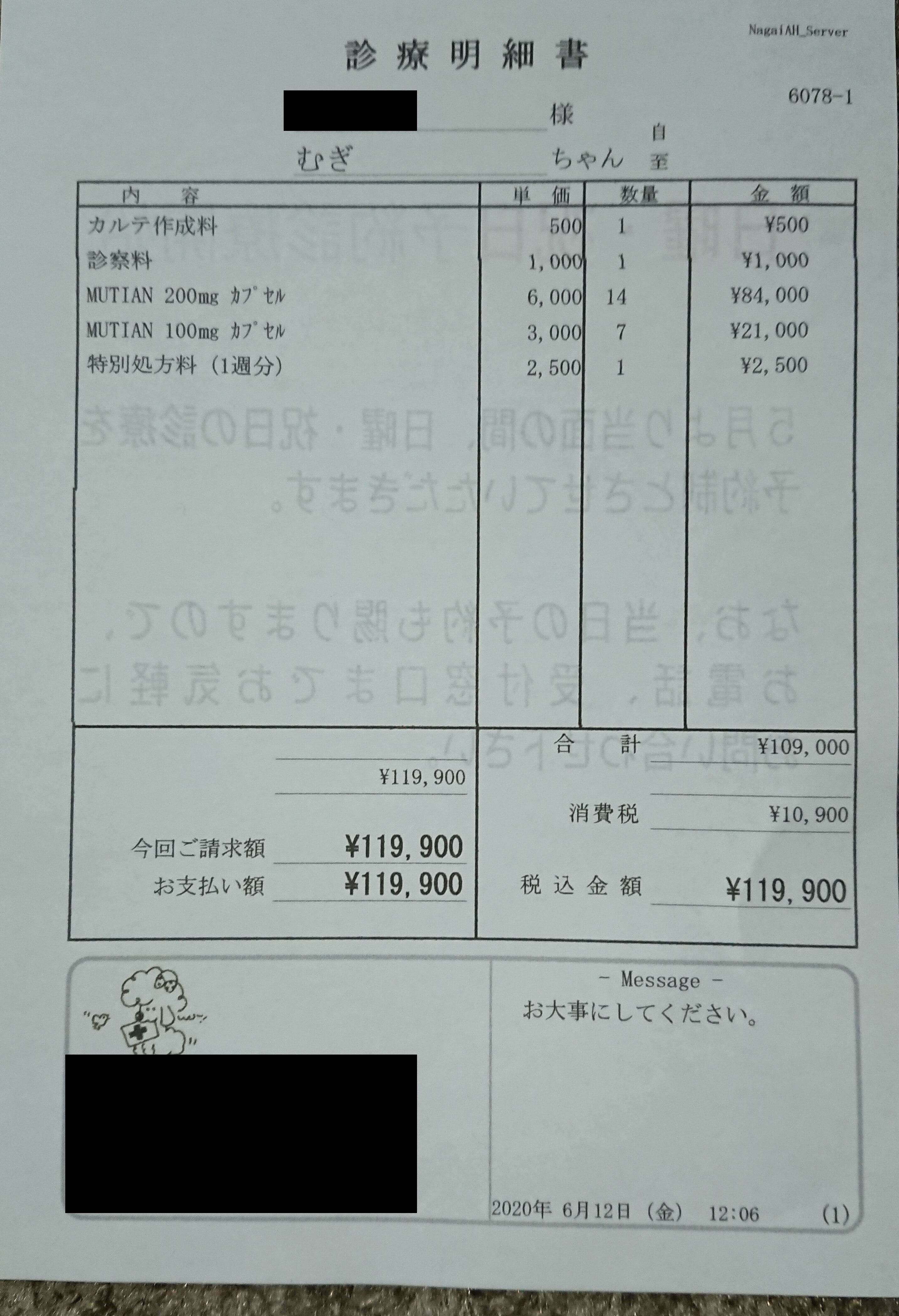 そんななかやっとたどり着いたのが日本認可外の新薬でした。ステロイドなどがアレルギー反応を緩和するのに対し、この新薬は免疫システムを向上させ健康状態を改善していくとともにFIPを治療していくことができる抗ウイルス薬です。驚いたのですが、このお薬を84日間毎日同じ時間に与えると、80-90%まで生存率が高まるそうです。ただし、このお薬は日本への輸入が2019年から始まったばかりで、まだ国内では認可がとれていません。大変高額であることは、ネットでつけた予備知識でわかってはいましたが、これが想像以上に高額でした。。。