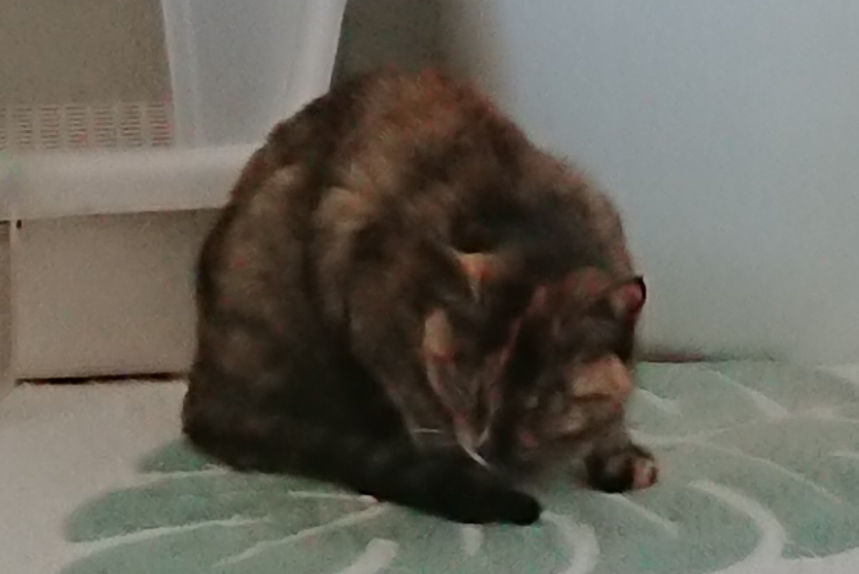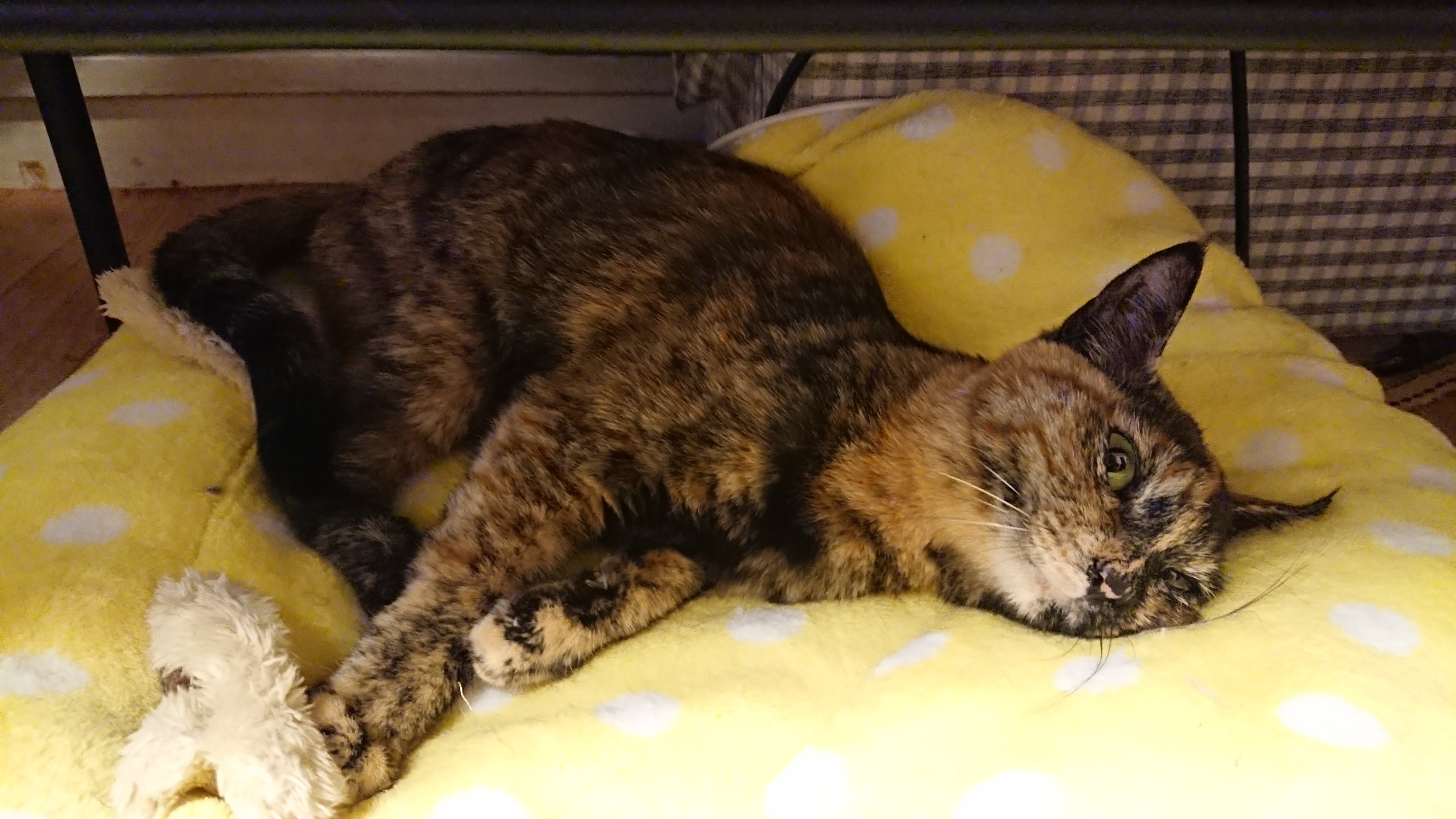 この文章を書いている現在、投薬2日目ですが、驚くほどに状態が改善し始めています。どこかに移動したくても体を起こせなくて、ごろんと横になったままはいつくばって移動していたむぎが、かなりふらふらしていながらも自分の力で歩き出したのです。丸くなって寝ることができなかったのに丸くなって気持ちよさそうに寝息を立てて寝ています。伸びやあくびをするのも10日ぶりぐらいに見ることができ、自分からご飯がほしいとキッチンにいる私の足元に来るようになったのです。こんなすぐに効きはじめるのかという驚きとともに、うれしくて、愛おしくて、泣いてしまいました。この姿を見て、きっとこの薬をちゃんと最後まであげられれば元気になるのではないか、いや絶対元気になると確信じみたものを感じました。投薬1日目。少し楽になったのか丸くなってくつろぐむぎ
