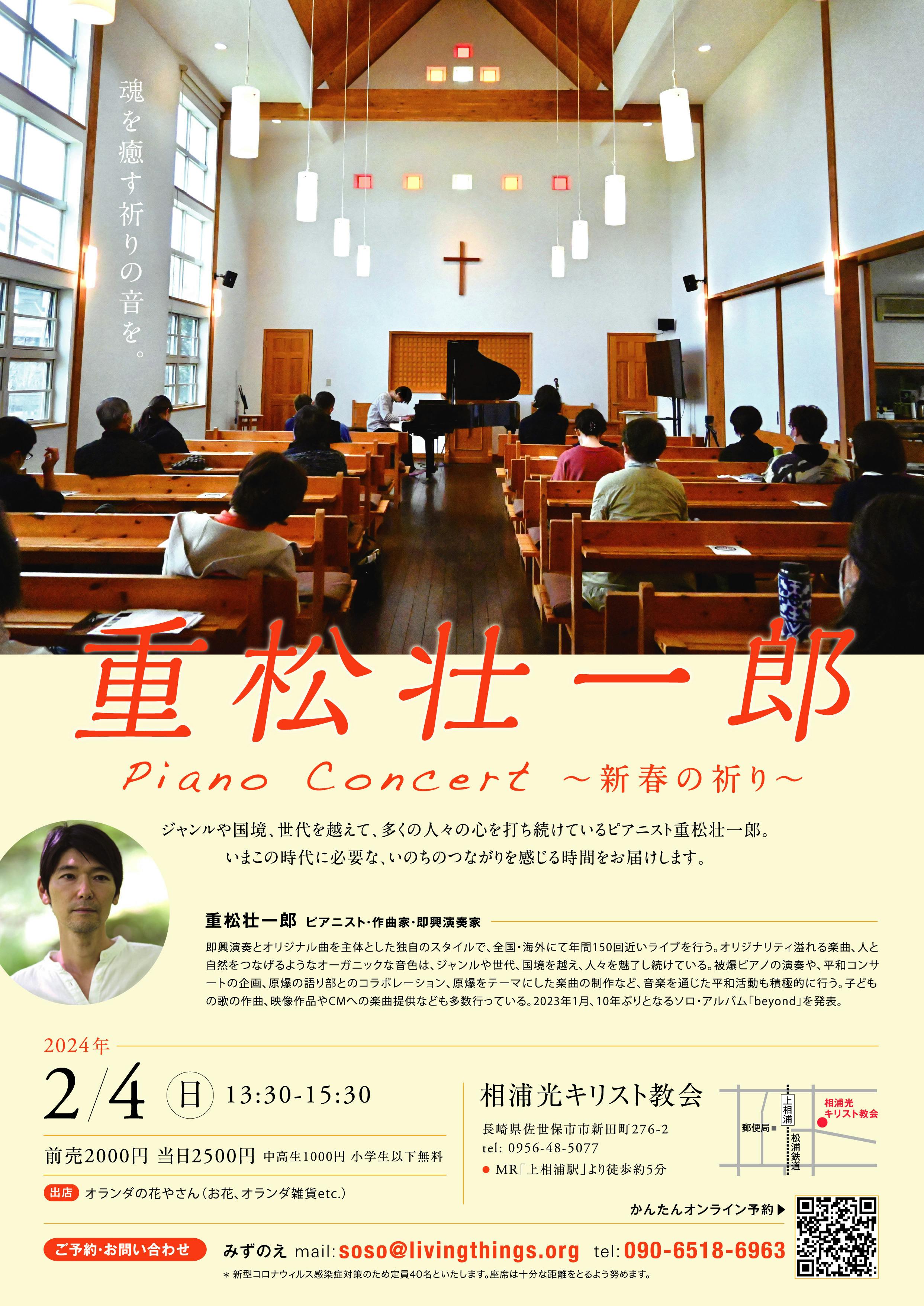 即興演奏とオリジナル曲を主体とした独自のスタイルで、全国・海外にて年間150回近いライブを行う。アメリカ、オーストラリア、タイ、ヨーロッパなど海外でも多数公演。「生きとし生けるものすべてに向けた音」をテーマにしたオリジナリティ溢れる楽曲、人と自然をつなげるようなオーガニックな音色は、ジャンルや世代を越え、多くの人々の心を打ち続けている。被爆ピアノの演奏や、平和コンサートの企画、被爆者とのコラボレーション、原爆をテーマにした楽曲の制作など、音楽を通じた平和活動も積極的に行う。子どもの歌の作曲、映像作品やCMへの楽曲提供なども多数行っている。アルバム「tsumugi」「森あそび 2」、シングル「SPUR」は、iTunes、Amazon等にて、好評配信中。コロナ以後は、重松壮一郎 YouTubeチャンネル(https://www.youtube.com/sosopiano)でのライブ配信、Podcastにてネットラジオ「Soso’s Radio」配信、子どもたちのとの楽団活動、音楽劇「共生する音楽」の企画制作など、困難な状況だからこそよりクリエイティブに、精力的な活動を展開中。2023年1月、10年ぶりとなるソロ・アルバム「beyond」を発表。