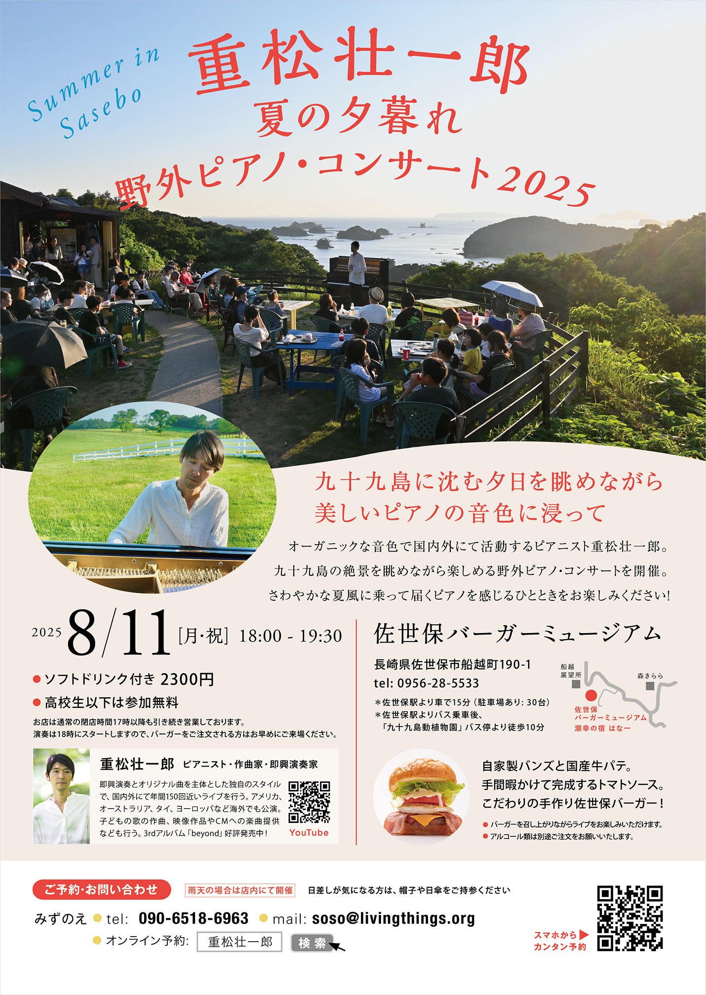 2025/07/28 20:03こんにちは、ピアニストの重松壮一郎です。きたる8/11(月・祝)、昨年大好評だった佐世保・九十九島の絶景を眺めながら楽しめる野外ライブを今年も開催します!夏の夕暮れどきに、夕涼みをしながら、眺望抜群の野外テラスで、生のピアノ演奏に浸っていただけます。会場の佐世保バーガーミュージアムでは特製バーガーはもちろん、ビール、ポテトなどサイドメニューなどもいただけます。沈む夕日を眺めながら、特別な夏のひとときをお楽しみください!━━━━━━━━━━━━━━━━━━━━重松壮一郎 夏の夕暮れ野外ピアノ・コンサート 2025━━━━━━━━━━━━━━━━━━━━◯とき: 2025年8月11日(月・祝)◯会場: 佐世保バーガーミュージアム(長崎県佐世保市)◯時間: 18:00 - 19:30◯料金: 2300円(ドリンク付き)高校生以下は参加無料◯出演: 重松壮一郎(ピアノ)【ご予約・お問い合わせ】https://www.livingthings.org/schedule/250811_burger/昨年の動画はこちら↓↓↓ もっと見る