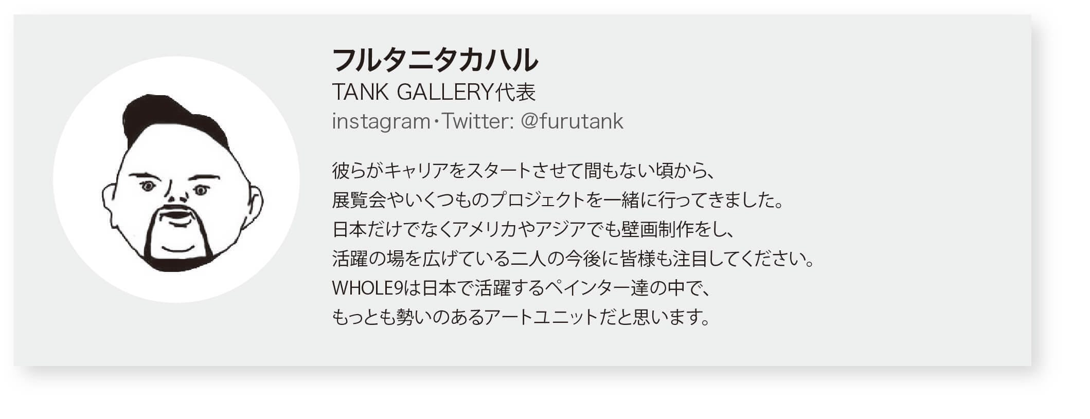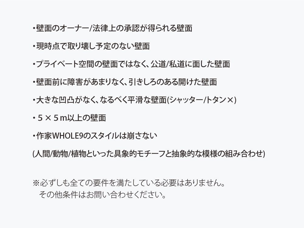 上記[①壁面の募集]についてはコメント、もしくはinfo@whole9.jpまでお気軽に情報をお寄せください。