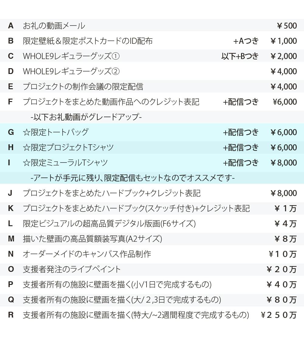 この機会にしか手に入らない特別なオリジナルグッズや作品の数々、制作に関する情報のクローズドでの配信、ライブペインティング/壁画制作など、様々なものをご用意しました!日本をポジティブにするプロジェクトにお力をお貸しください!