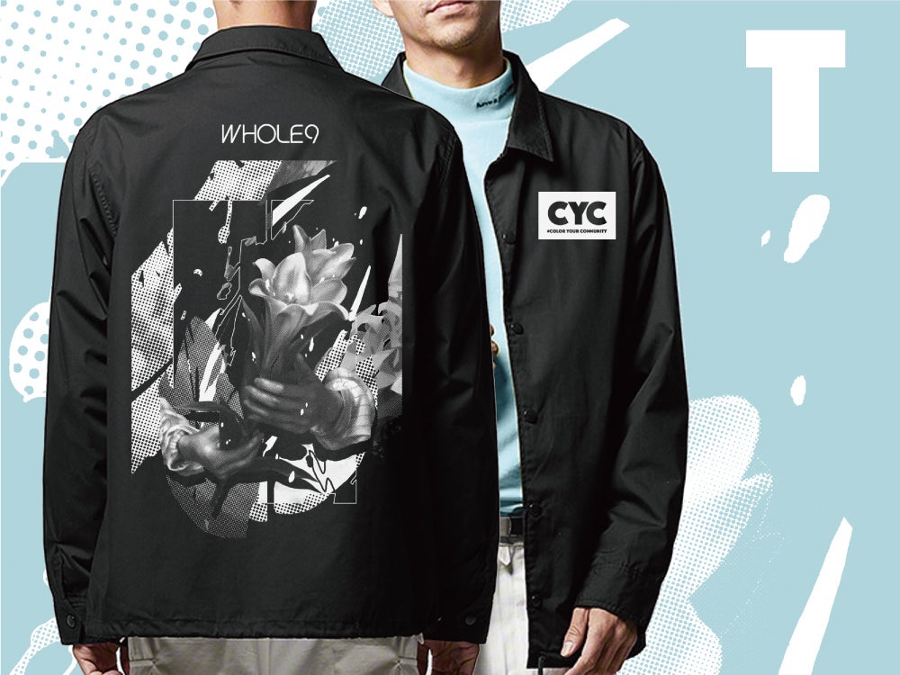 白黒加工の#CYCビジュアルが背面にプリントされたコーチジャケット。