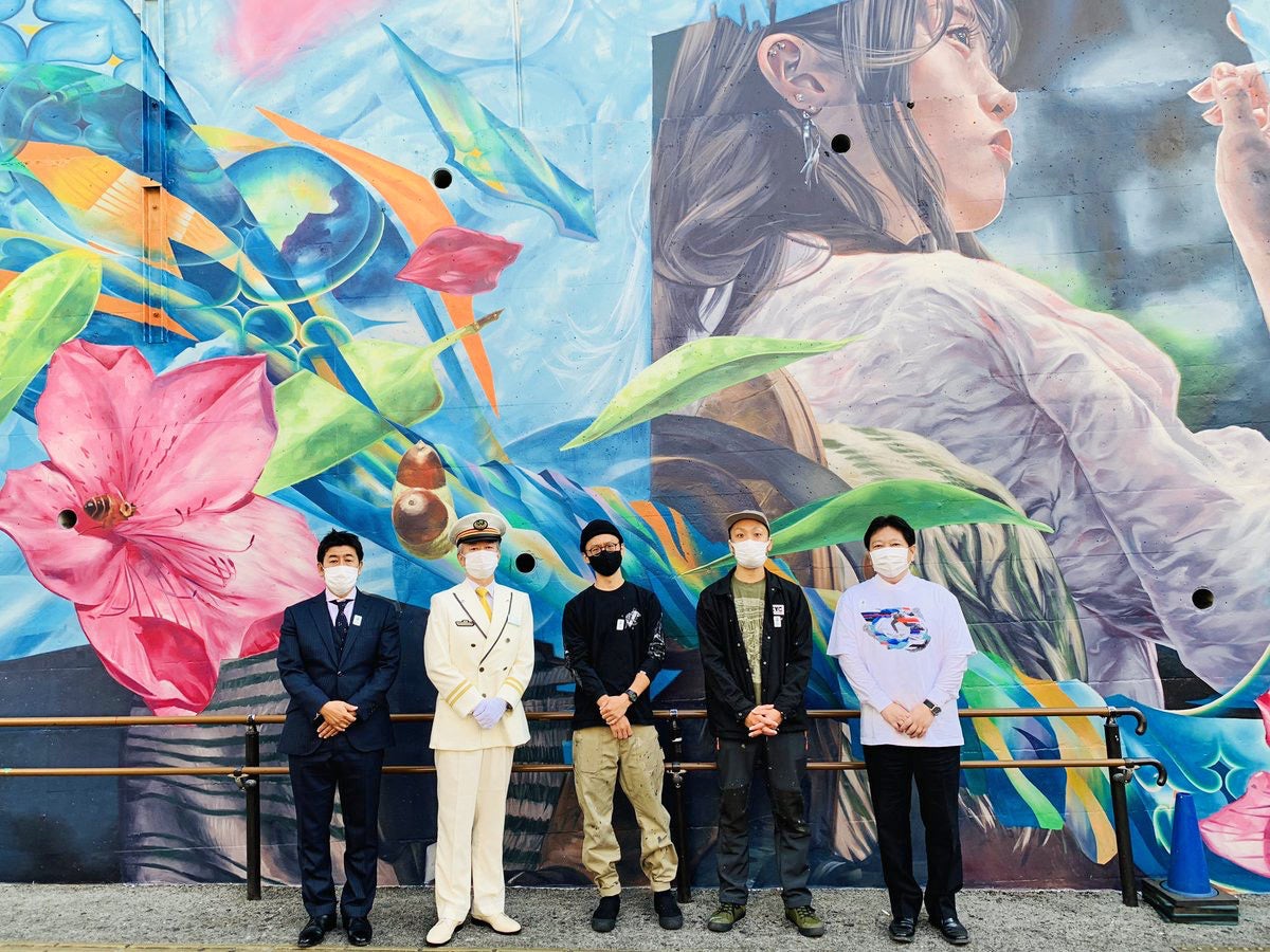 左から ヌリーズ 佐藤社長, 中野駅 宍田駅長, hitch, simo, 中野区 酒井区長完成後20日には中野区長と中野駅駅長、ヌリーズ代表の佐藤政夫さんとの壁画完成記念式典を行い、絵のタイトルを発表しました。