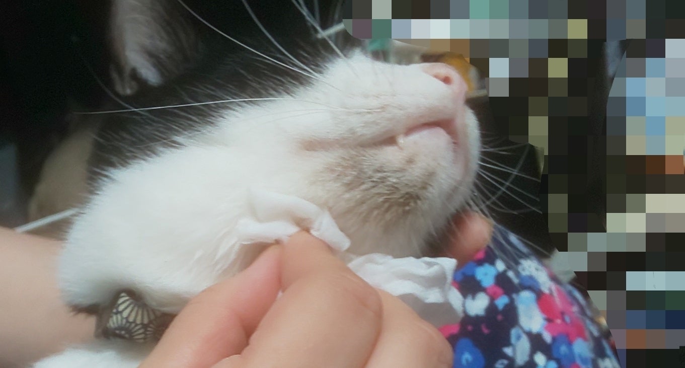 猫用シャンプーをタップリつけてふやかした後優しく拭き取ります。