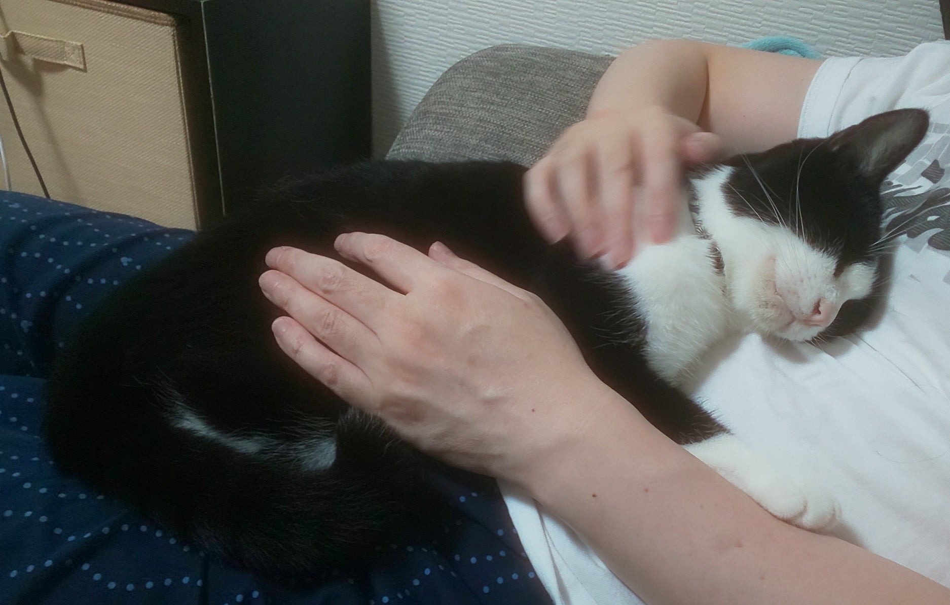 夫のお腹の上は普段ココさんの特等席でルイちゃんは気を使っているのか余り乗りませんが、