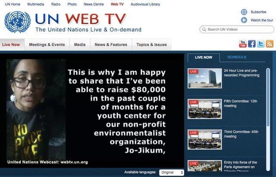 こんにちは! アース・カンパニーマーケティング担当小松です。 気候変動の被害者の声が世界に届けられる機会は少ないからこそ、キャシーの人の心に響く天性の言葉力、発信力が世界から注目されています。 昨年11月4日の地球温暖化対策の国際的枠組み「パリ協定」の発効を受けて、ニューヨークの国連本部で潘基文(パンギムン)事務総長が、地球温暖化対策に取り組む市民団体の代表者らとパリ協定の発効を祝うイベントを開催しましたが、このイベントにも世界中から選ばれた8団体の1つとして、キャシーは参加しているのです!! キャシーはマーシャル諸島から動画での参加となりましたが、キャシーの発信力は国連からも期待されています!! 6月には、そんなキャシーに日本で会えます!! 一見、小柄で、どこにでもいそうな普通の女の子(といっても、3歳の娘を持つ母親ですが)。 しかしそのスピーチは、どこからこんなパワーがと思うほどの迫力です。 支援をいただいた皆様をご招待させていただくイベントでもそのスピーチを披露いたしますので、ぜひ楽しみにしてください!!