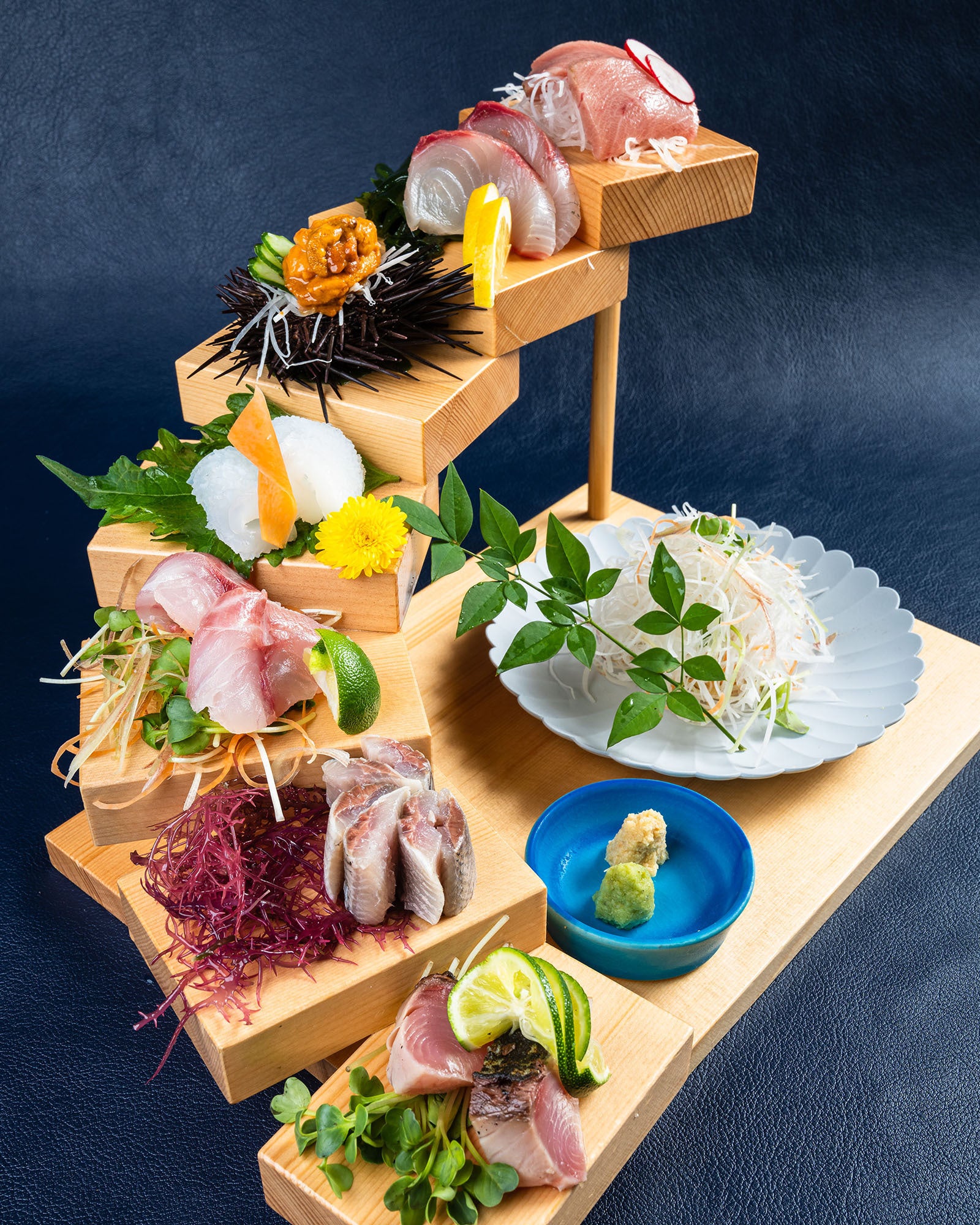 階段状の板にお刺身を並べる「お刺身階段盛り合わせ」