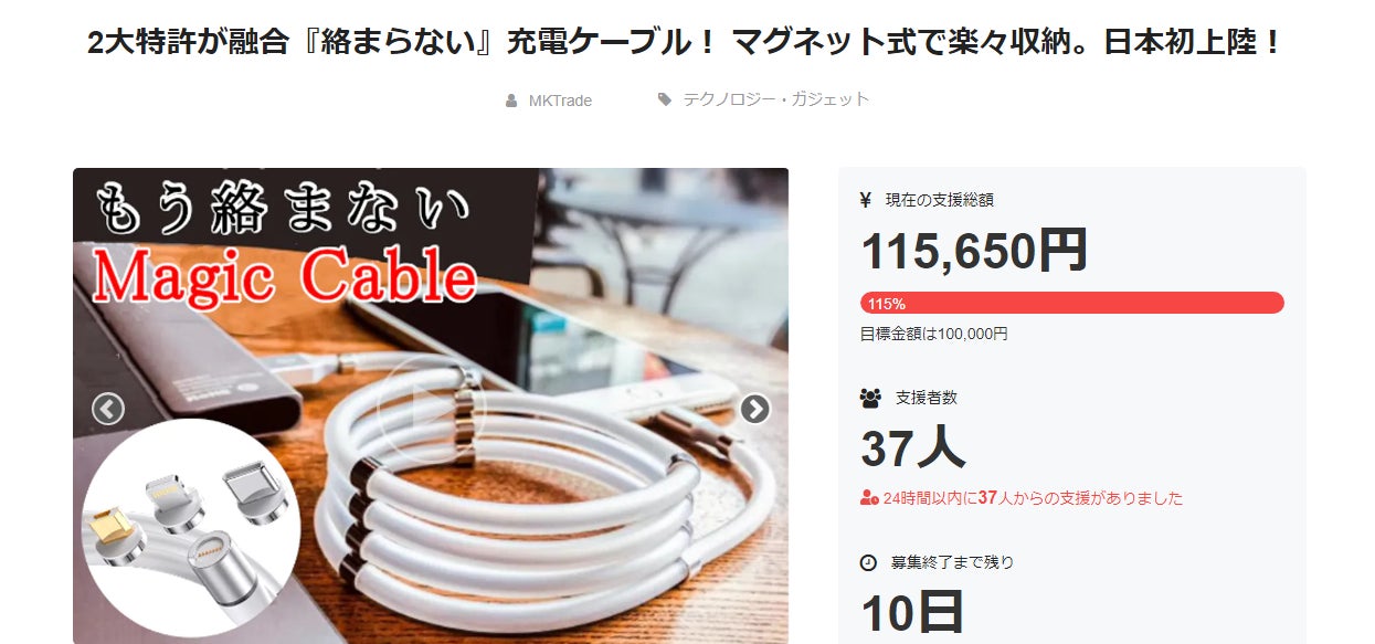 いつもお世話になっております。本日より、"絡まらない"充電ケーブル『Magic Cable』プロジェクトを公開させていただきました。マグネット端子によりワンタッチで充電接続出来てしまう時にも楽ちんの便利な充電ケーブルです。お陰様で開始4時間で目標の60%を越えており、初日で目標達成する勢いとなっております。短い期間ですが、キャンペーンも検討しております。最後までどうぞよろしくお願いいたします。『Magic Cable』プロジェクトスタッフ一同