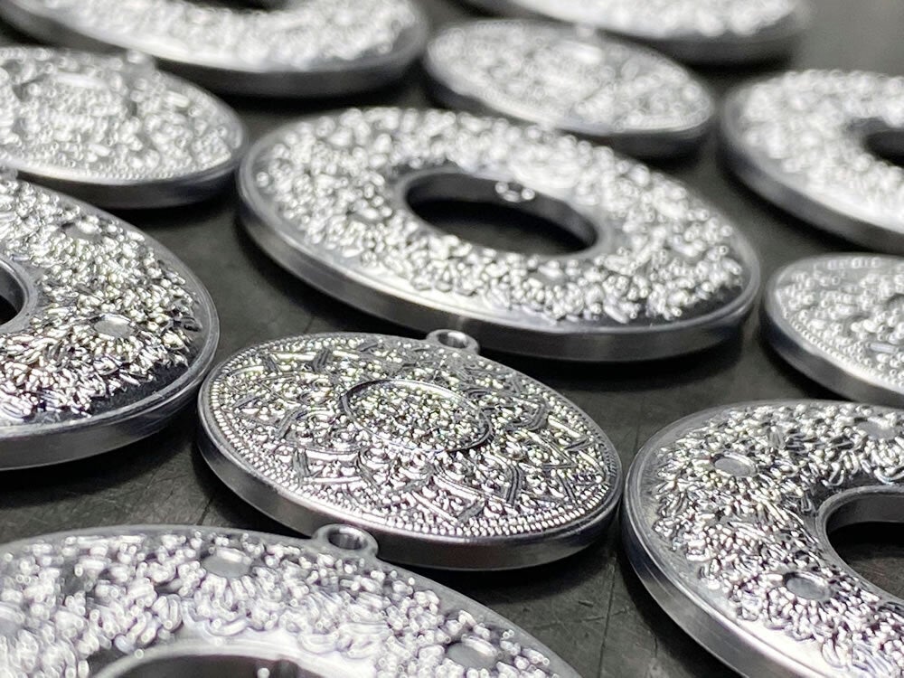 ジュラルミンに「半月一枚刃」で曼荼羅の美しく繊細な世界を彫刻しております。