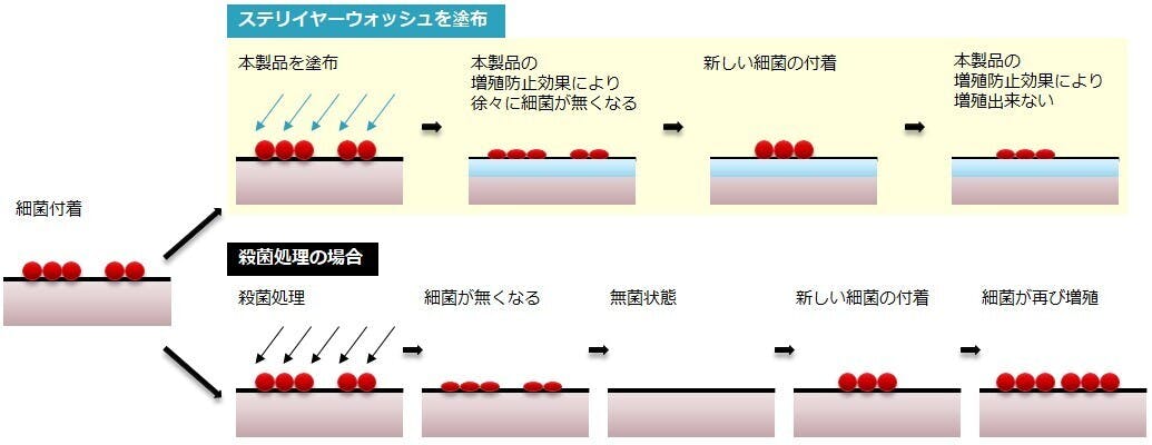 細菌やカビは、ライフサイクルが非常に早いため、次々と増殖→死滅を繰り返しているのですが、コーティングする事により次の世代の菌が定着出来ないため、徐々に菌が死滅して行きます。