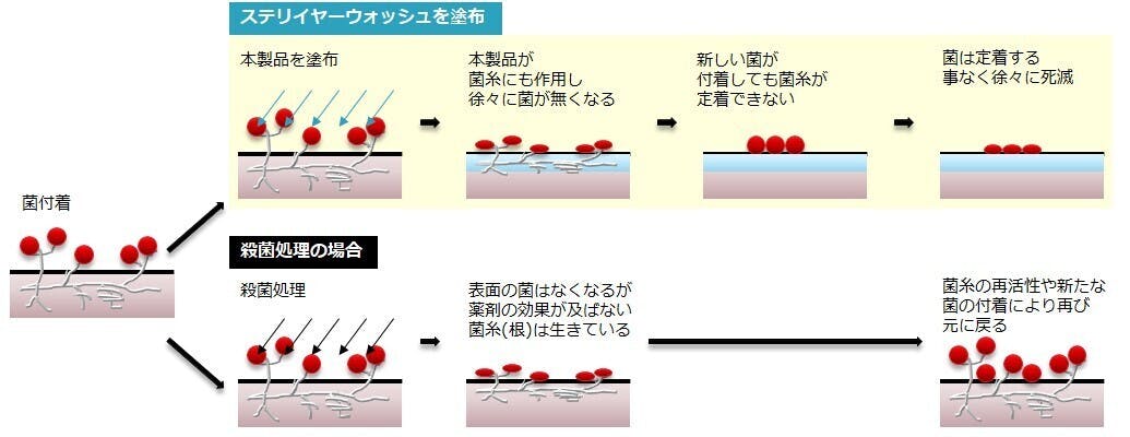 ステリイヤーウォッシュは、全く違うアプローチで細菌やカビの発生を抑えます。