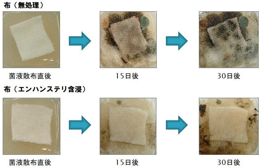 エンハンステリの効果実験(無処理の布と、エンハンステリを浸した布との比較)