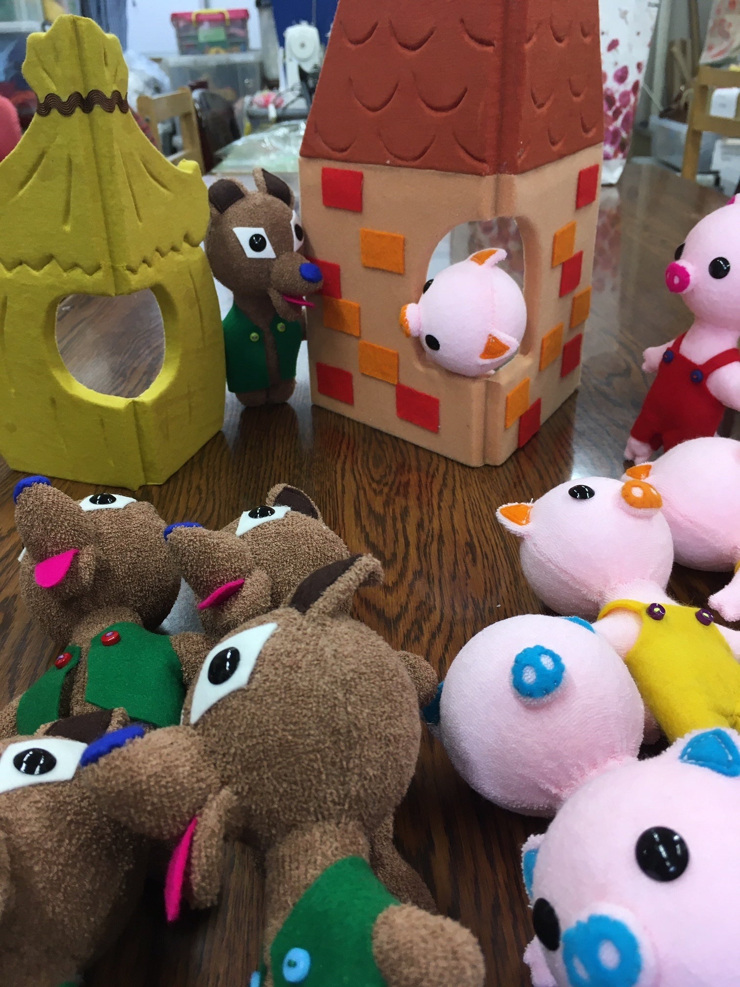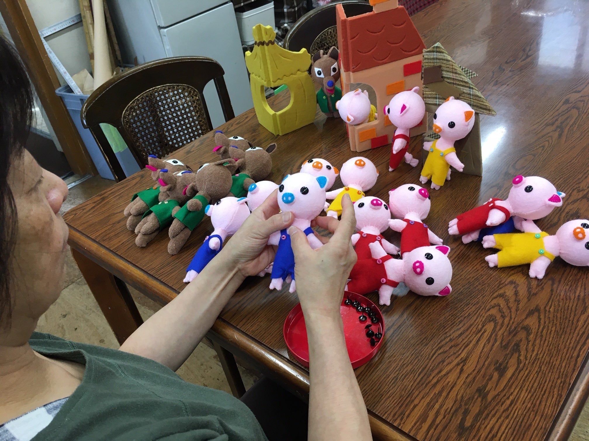 画面奥から「赤ずきんちゃん」「人形つくりキット」の完成品