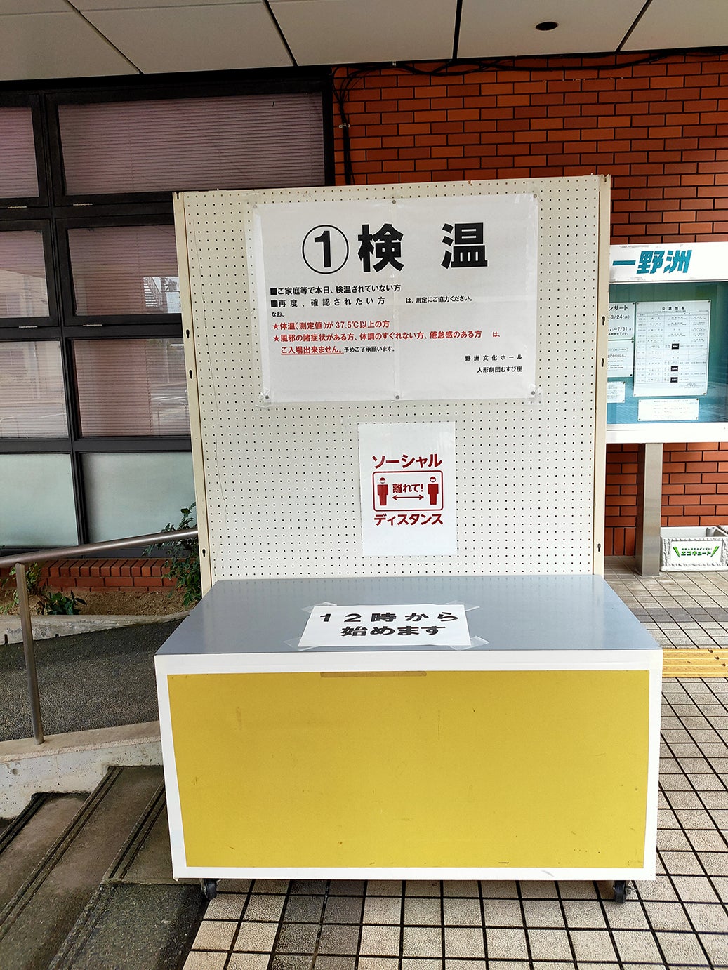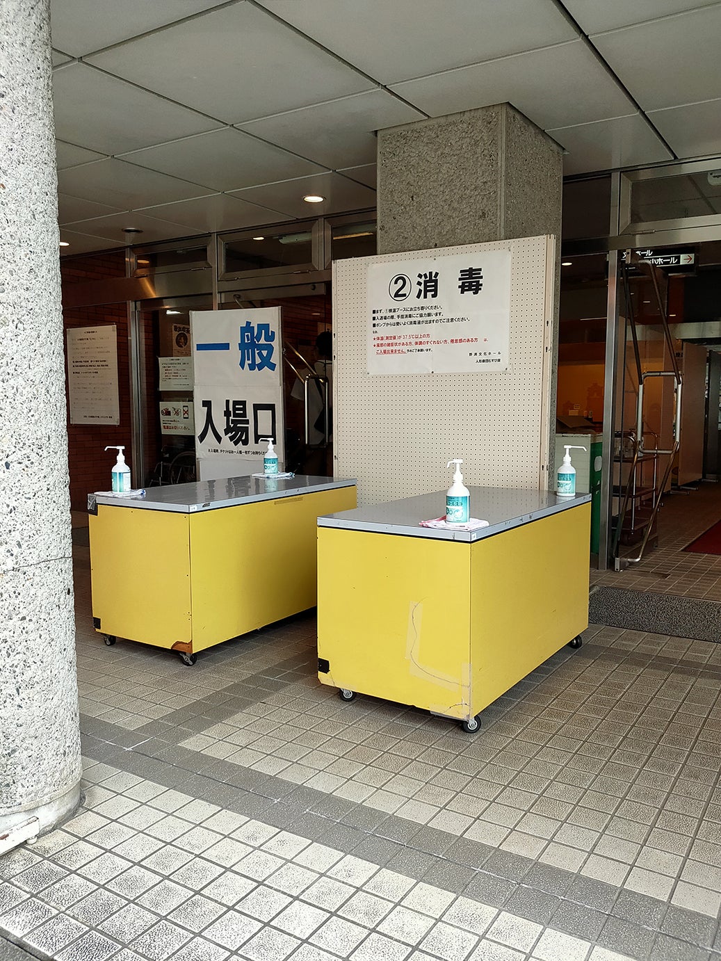 会館に入る前のお客様の動線を考えながら、極力ご負担を少なく、感染対策にご協力いただけるようブースを設置しました。