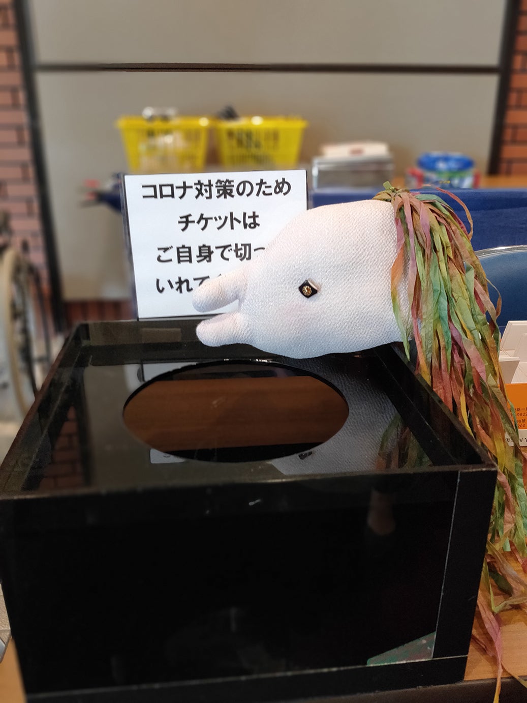 通常であればチケットの半券はスタッフが切らせていただいていますが、今回はお客様にお願いしました。(むすび座版、疫病退散の妖怪・アマビエの人形に見守ってもらっています)