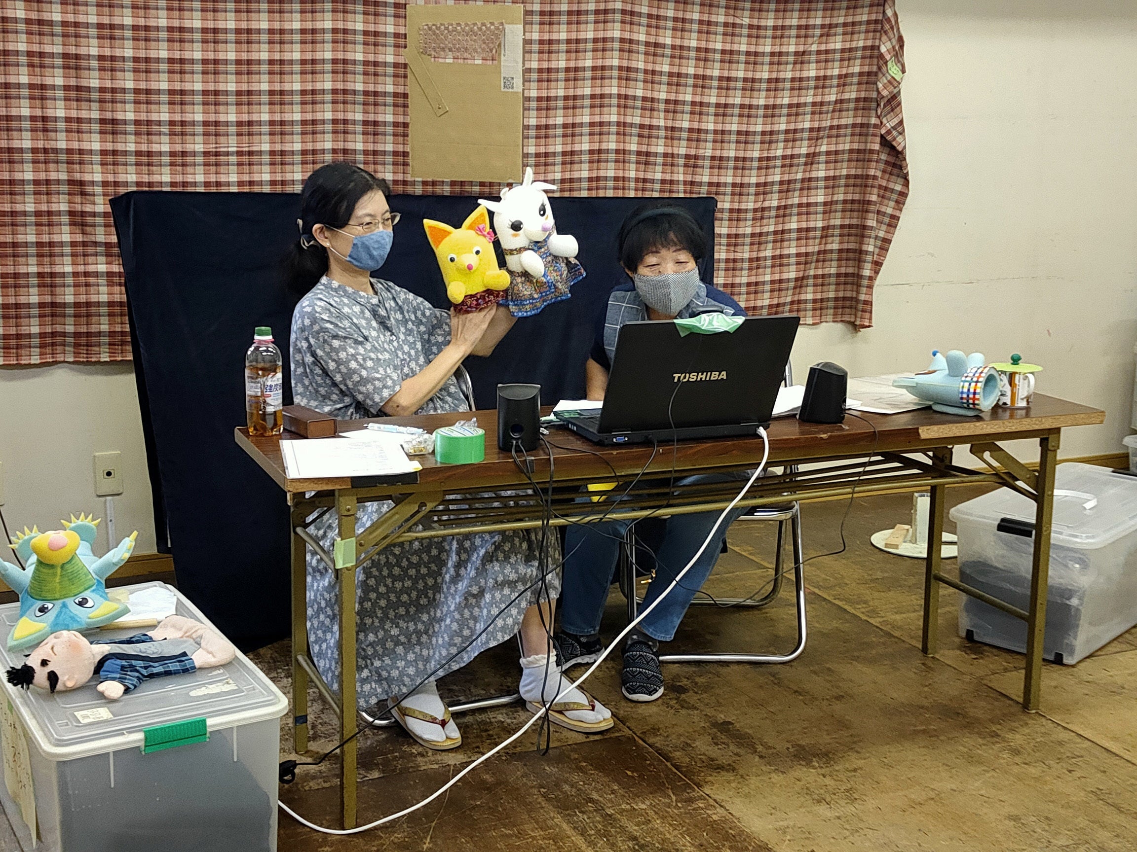 (↓リモートで実施することになった小学校での「人形劇指導」。戸惑いつつも、よりよい方法を模索中)