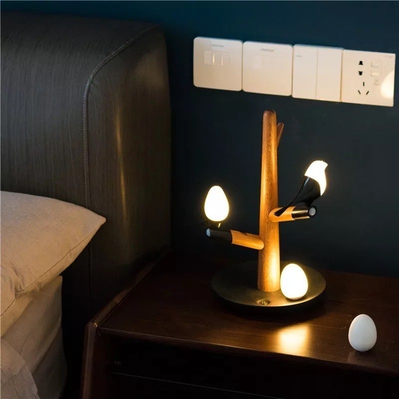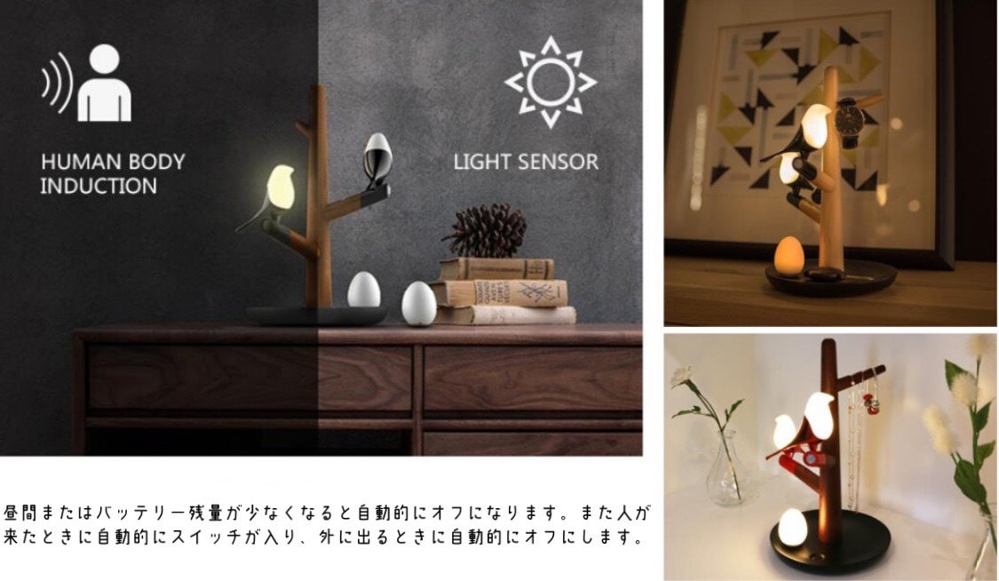 本品は小鳥と卵を外してハンドライトや壁掛けライトとしても使用することができます。小鳥や卵をとまり木に磁気接続することによって小鳥、卵を充電できます。