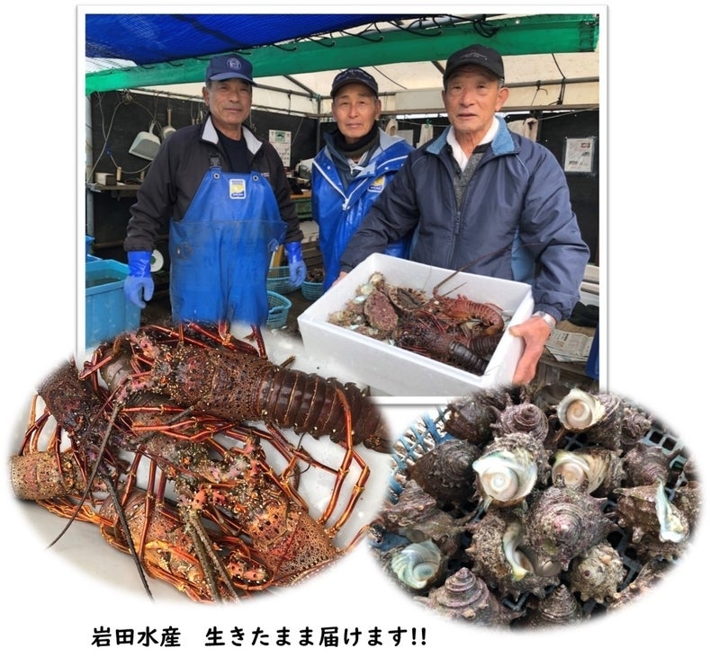 岩田水産が奈留島近海で獲れた天然の伊勢えびとサザエ、アワビを生きたままお届けします。