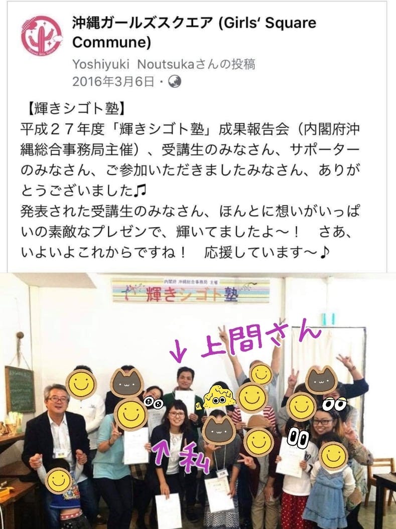 シゴト塾の最後の発表会で、発表を終えた後、上間さんがキラキラさせた目をして、熱く応援のコトバをくれたことを今でも覚えています!!