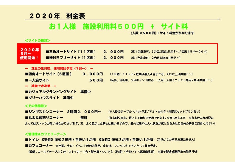 『施設利用料お1人様500円+サイト料』にて
