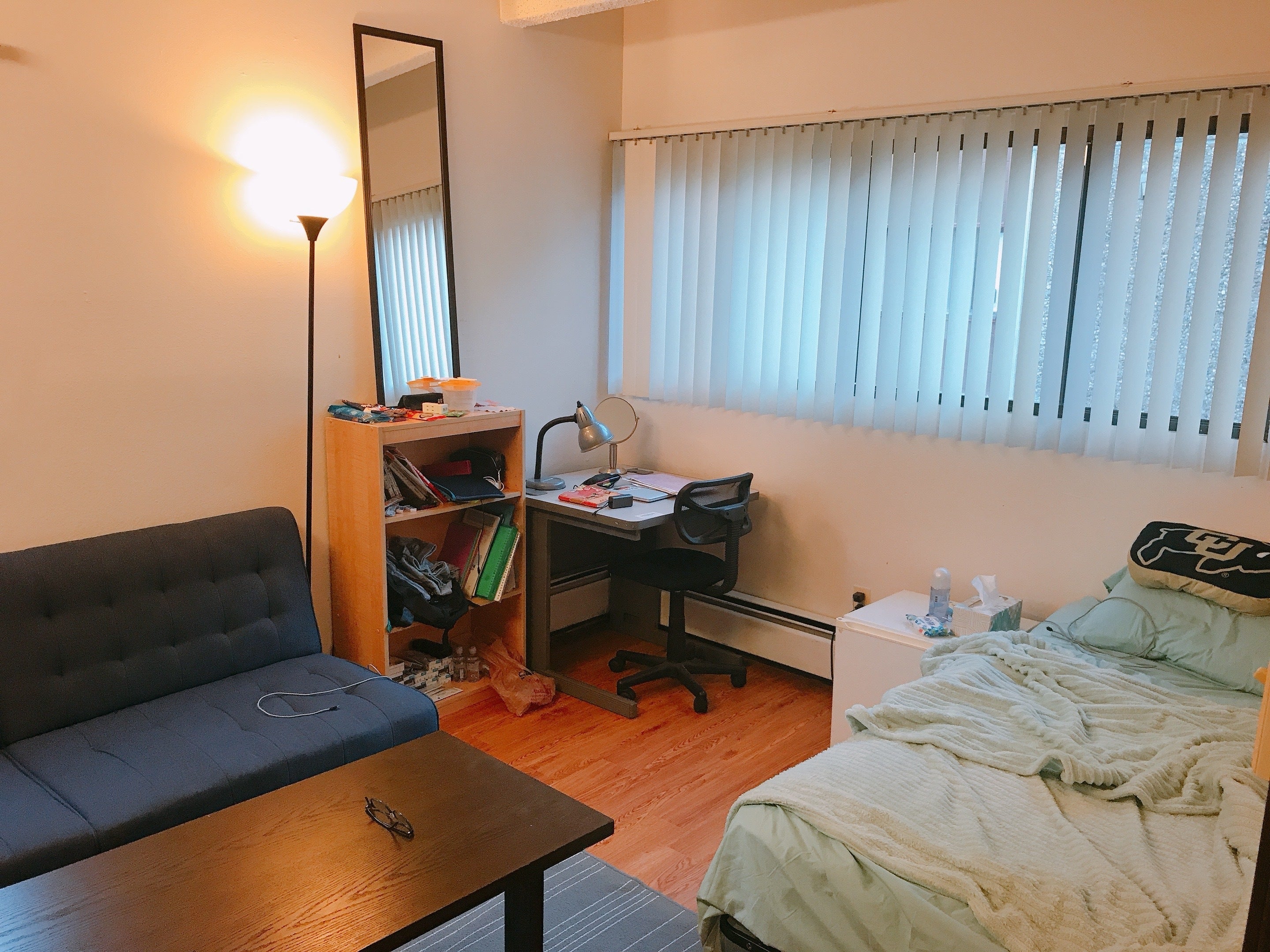 写真に映ってる家具の中で買った物はベッドのシーツ・枕カバー・ブランケット・クッションくらいで、それ以外のものは元々あった(前に住んでた人が残してった)ので、ありがたいです。