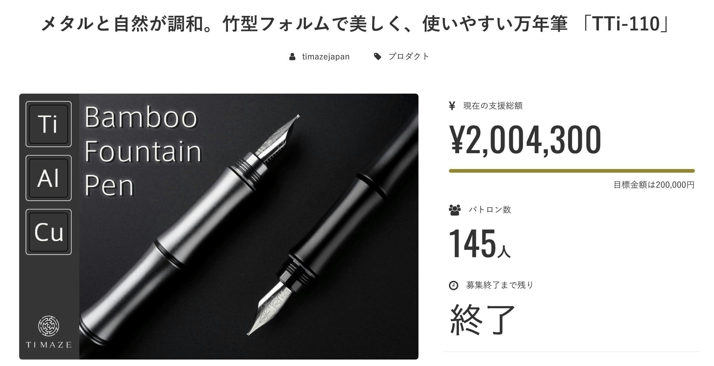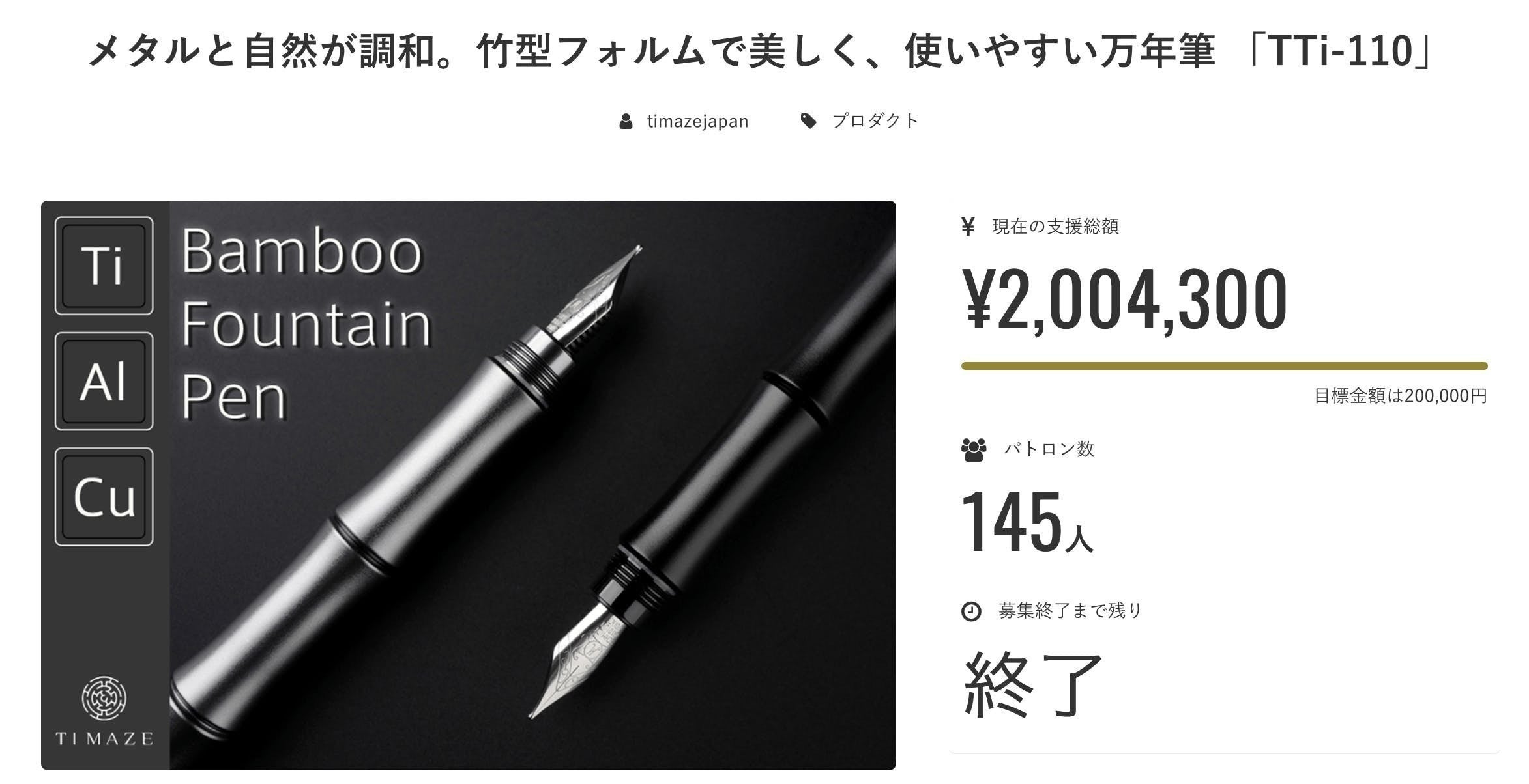 2022/12/29 17:00新たに2つのプロダクトをローンチします!「TP1」ご支援者の皆さまご無沙汰しております。Timazeです。本日は「TTi-718/918 V2」「TTi-110」の2製品のローンチが決まりましたので、お知らせです。TTi-718/918 V2https://camp-fire.jp/projects/view/612665今回、TTi-718|918は細部のデザイン面でアップデートを行いました。旧デザインでは、外郭の親骨はなめらかにゆるやかに曲線を描いていましたが、シャープでメリハリ、エッジのある形状に進化しました。見た目として美しくなっただけではなく、持ち手の部分が細くなったことで、より手に馴染むように。今回は細部のチューニングで長らくお待たせしてしまいましたが、交換扇面や要の交換パーツも用意しております。------TTi-110https://camp-fire.jp/projects/view/631783TTi-110は、竹型とユニークなフォルムや竹の節が描く曲線で手に馴染みやすいなど、魅力を備えます。素材やカラーのバリエーションも豊富に。素材はアルミ・コッパー・チタンから選べ、さらに同じチタン素材でも仕上げの異なるバリエーションをご用意しました。特別なモデルとして、鏡面仕上げチタン[P-Titanium]もご用意しました。鏡面仕上げチタンは、ブラック、ゴールド、ブルー、ローズゴールドとカラーバリエーションも豊富。ペン先(ニブ)まで本体カラーと同一に仕上げ、高級感を追求しました。ブルーやゴールド、ローズゴールドなどあまりTimazeでは展開をしていないカラーも含んでいます。---気になった方は、上記画像の黄色の枠部分でお気に入り登録いただけると、公開時にメールにて通知がありますので、登録のほどよろしくお願い申し上げます!Timaze もっと見る
