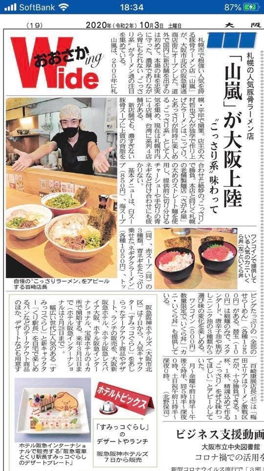 弊社運営の『札幌山嵐梅田東通り店』が新聞で取り上げられました^^