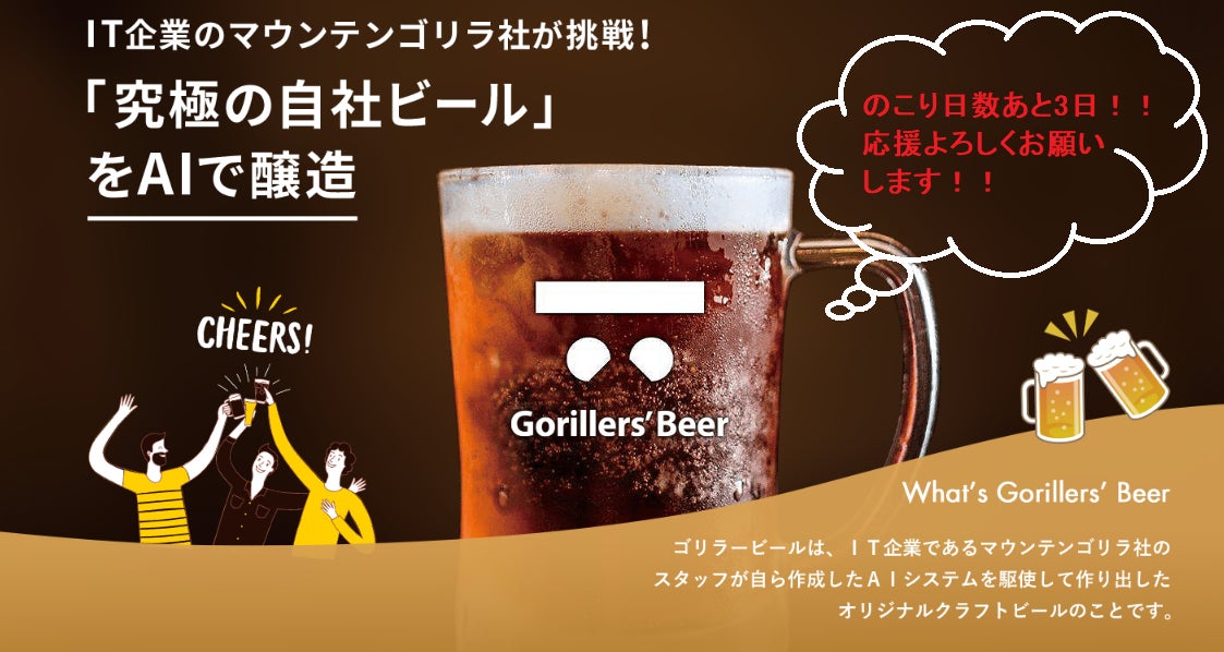 いつもお世話になっております。株式会社Mountain Gorilla ゴリラービールチームです!ついに本日クラウドファンディング最終日を迎え、無事目標を達成いたしました。応援いただいた皆様には、心から感謝申し上げます!!本当にありがとうございます。明日8/1には、ブリューパブ様にてゴリラービールの仕込が行われます。マスク着用等コロナ感染防止対策をした上で、ゴリラービールチームの少人数で参加いたします。その様子なども弊社サイト・ブログ・SNS等にてお知らせしたいと思いますので、どうぞ楽しみにしていてくださいね!URL:https://mountain-gorilla.co.jp/本日も残りわずかとなりましたが、ぜひ最後まで応援よろしくお願いいたします!ありがとうございました。株式会社Mountain Gorilla ゴリラービールチーム