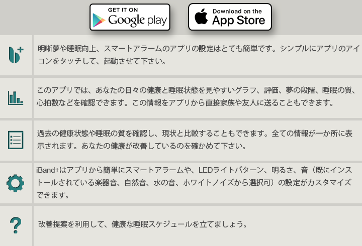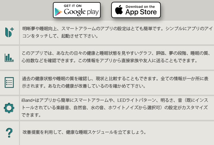 iBand+ヘッドバンドは、Bluetooth経由でiOSおよびAndroidスマートフォンのiBand+アプリと通信します。アプリは英語と日本語で利用できます。