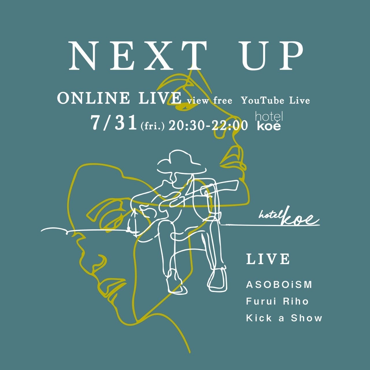 その第1弾として、休止以前からのレギュラーイベント「NEXT UP」の無料オンライン配信が決定。ASOBOiSM、Furui Riho、kick a showが出演する。