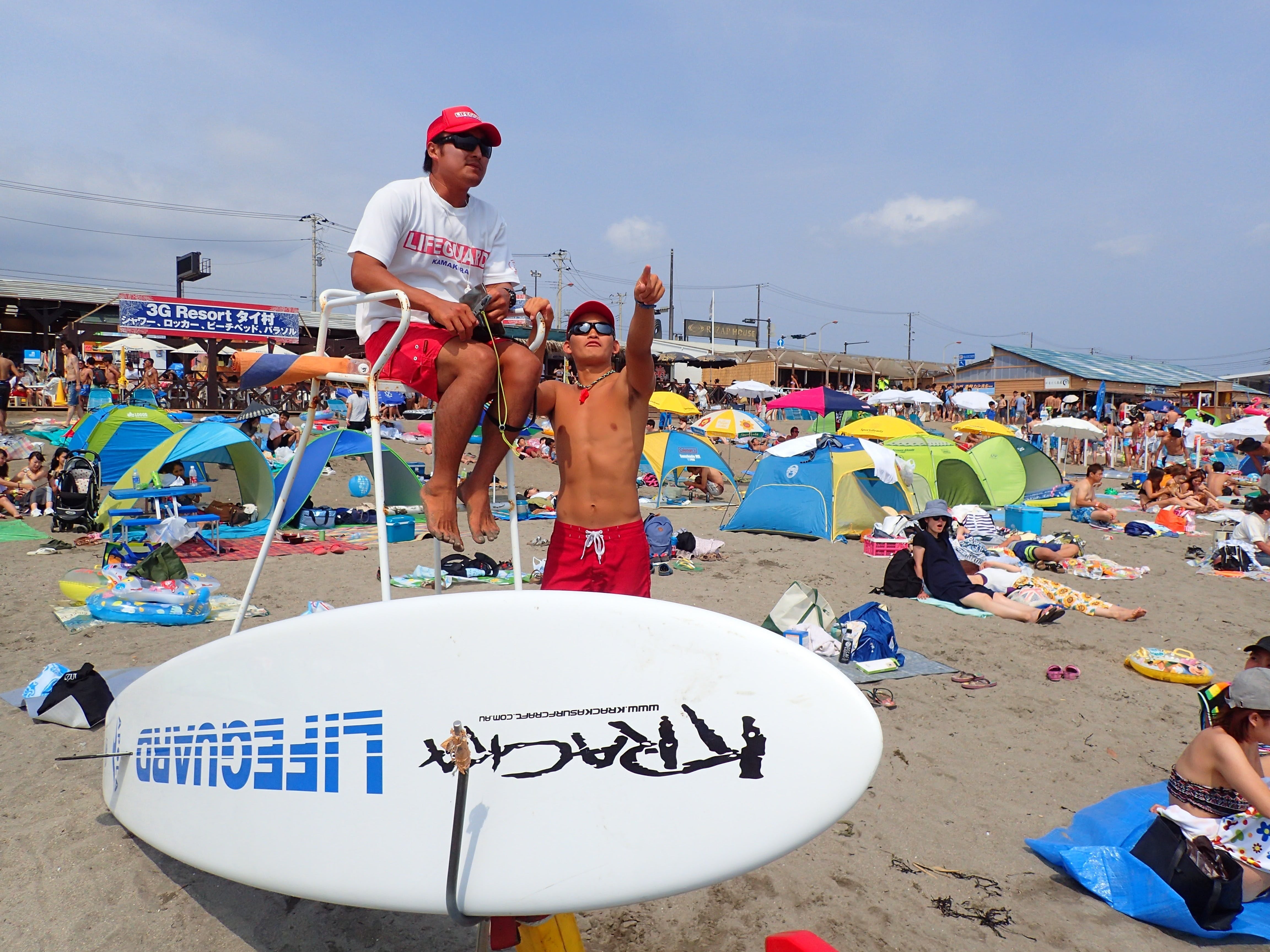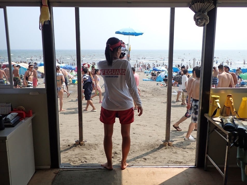 全員がマッチョで色黒かはさておき、我々はライフガードとして毎年7月、8月に鎌倉の3つの海水浴場(材木座・由比ガ浜・腰越)での監視活動を行っている団体です。