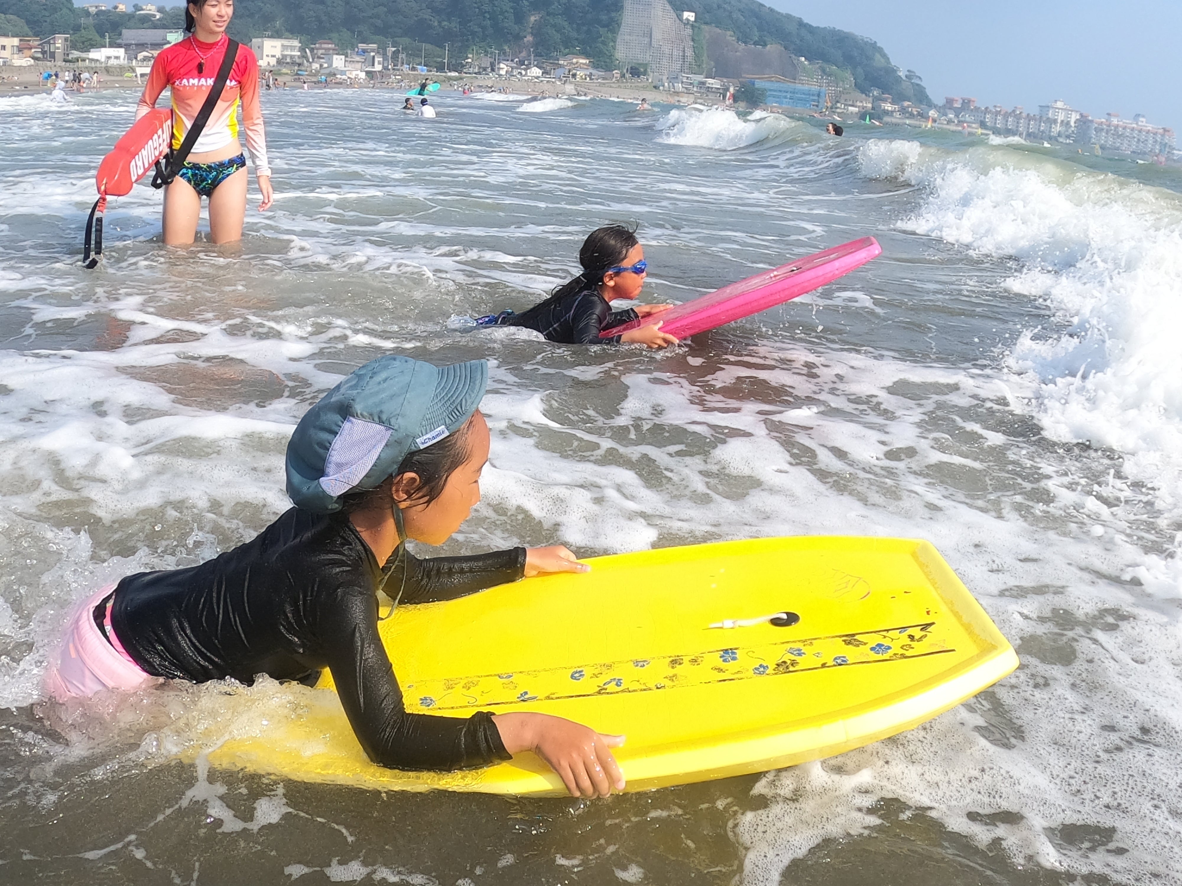 昨日に引き続き風波があるコンディション、浮き具やボディボードなどの特性を活かして遊んでもらいました。