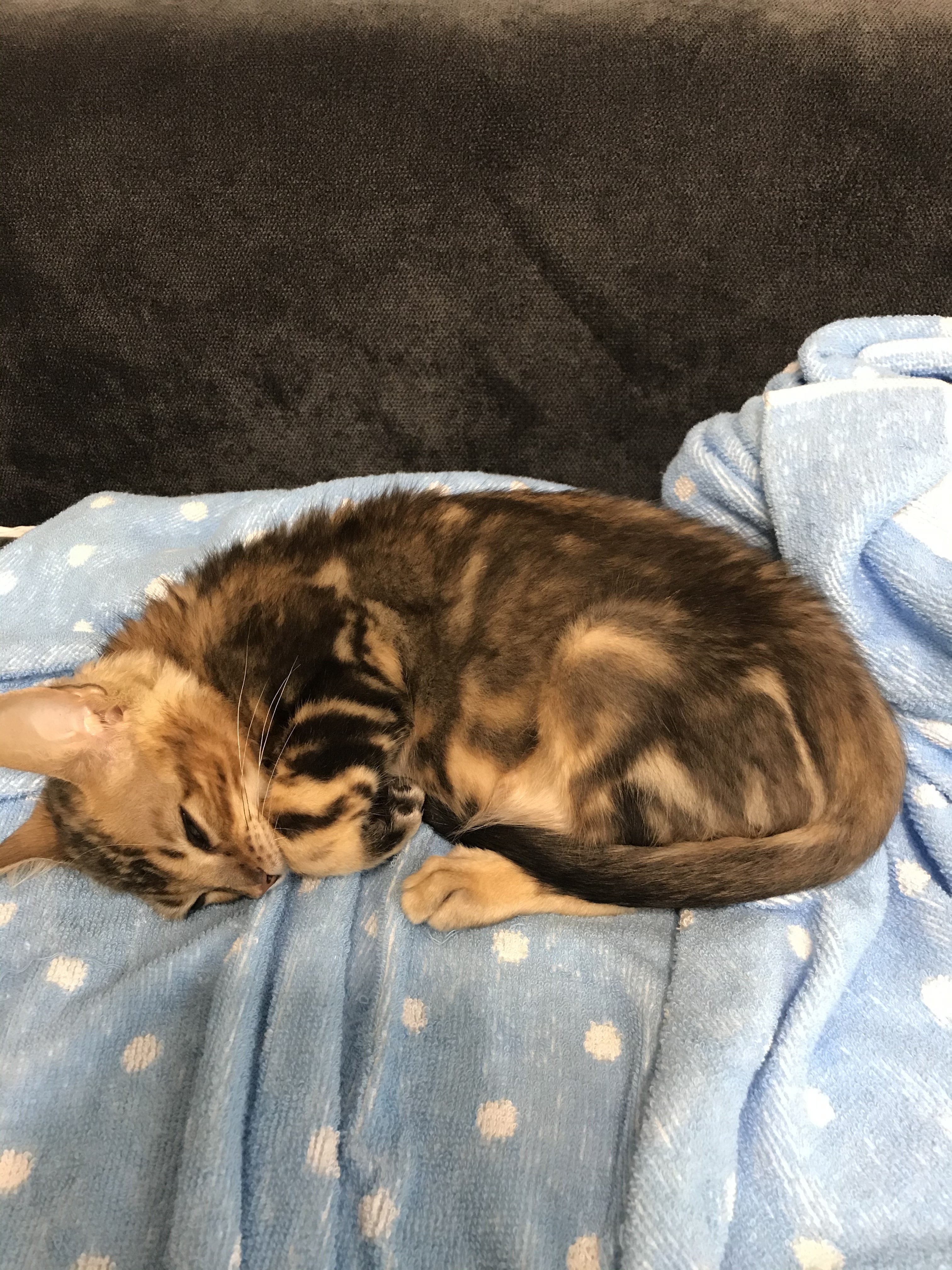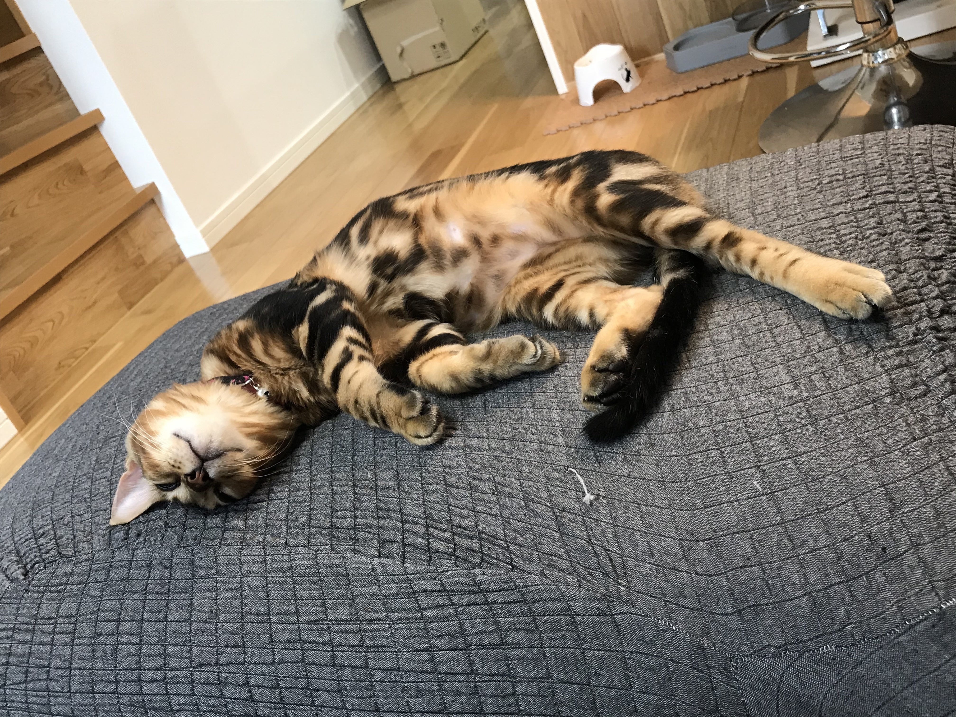 2020/10/25 15:00レオンの写真を漁っていると、ごろんと寝転がっているものばかり。観察すると、とことこ歩いてゴロン。ご飯を食べてゴロン。ゴロンとしながら毛づくろい。子供の内からこんなにゴロゴロしててよいものなのか?猫を飼うのが初めてなので、運動量が足りているのかどうかがわからないですが・・・・ただ・・・・恐ろしく暴れん坊でもあるんです。猫じゃらしは基本、使い捨て。以前友人が遊びに来た時に買ってきてくれた立派な猫じゃらしはものの3分でバラバラになりました。噛む力が半端ない!9/5ムティアン投薬が完了しました。8月上旬にAG0.7以上あり、8月中に0.6まで落ち込み、また徐々に回復して9/5には0.8になりました。体重も2.9→2.4→2.8と、レオンに取っては負担の大きい1カ月となりました。血液検査、あとは外注検査2つこちらの結果で再発がなければ投与は完了し、3カ月の経過観察となります。先生は投与完了後、2,3日で食欲不振などが起こったら再発の可能性があるのですぐに病院にくることという事を言われました。この数日間をビクビクしながら過ごします。レオンは順調に回復しているものの、うんちはやはり1.5日に1回のペース前回の二の舞にならないかがとても不安です。ご飯を変えたり、友人に「乳酸菌が最強 」と聞き、乳酸菌入りの缶詰と共にドライフードをあげたりしています。便が硬くない、たっぷり出る、という事から1.5日に1回がレオンの通常なのか?と思う事もあります。が、実際の所よくわかっていません。。。。再発の有無にかかわらず、また、先月体調を壊していた事もあり1週間後に再検査です。何事も内容祈りつつ、1週間を過ごしました。レオン自身は嘔吐もなくなり、元気も戻り、食欲も取り戻し、体重の増加に勤しむ毎日。私と母は再び 、じゃれてくるレオンの爪や歯で流血続きの毎日になりました。 もっと見る