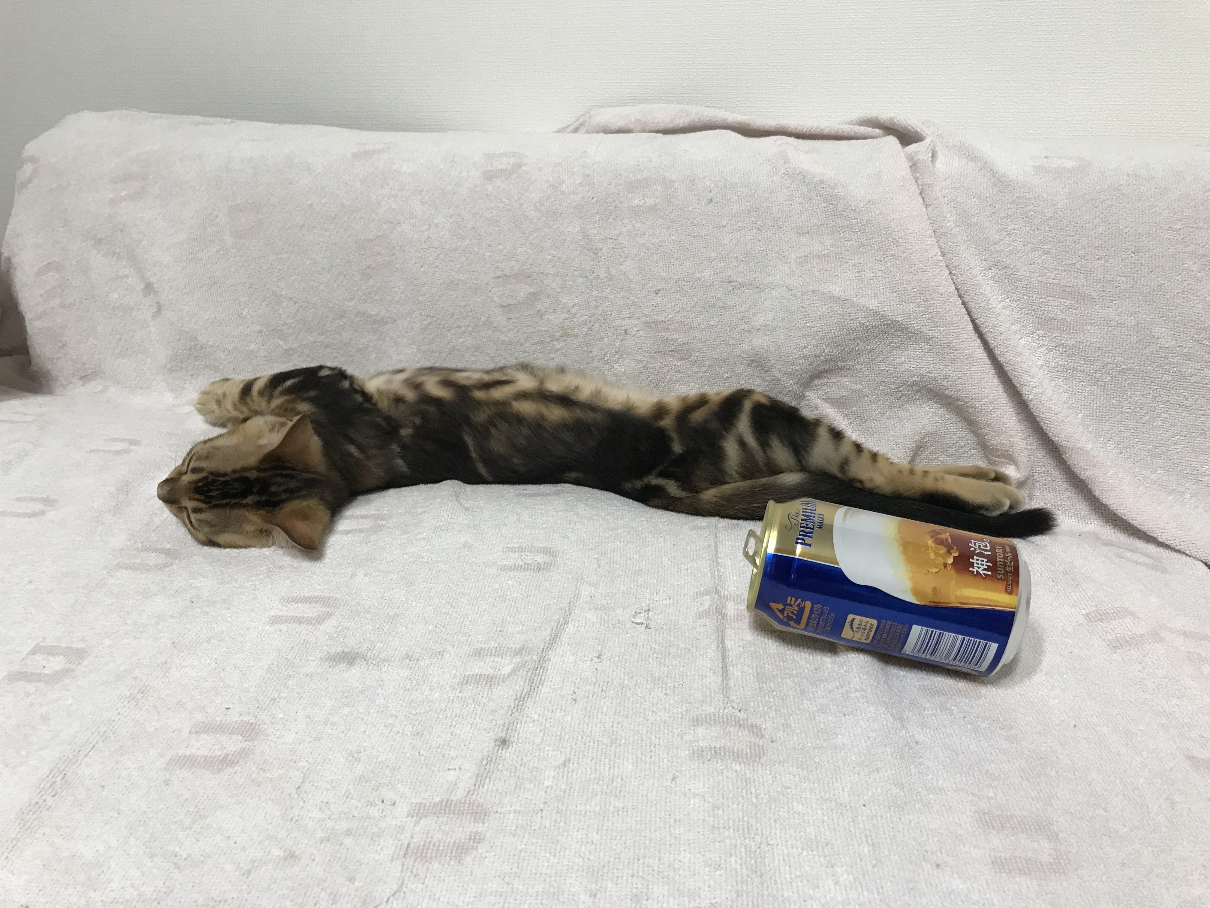 ご連絡おそくなり、大変申し訳ありません!また、活動報告を開始します。少し前の事になってしまいますがしばらくお付き合い頂ければと思います。↓以前書き途中のものです。-------------------------------------------------------------------------写真は長くなったレオン。対比プレモル350。かなり大きくなりました。ムティアン投与後、ぐんぐん大きくなる。7/11から、また2週間。病院までの間、レオンは元気いっぱいです。よく食べ、よく遊び、よく寝て、1日平均3ガブ。で飼い主が血を流します。通りすがりに噛み付いていくのは何なのか。アキレス腱穴開いちゃう。そんなうちのレオンには1日のノルマがありまして。①うんちをする。②ムティアン飲む。という割とハードルの高いノルマがあります。そのノルマなんですが①がね、ちょっと達成できないんです。1.5日に1回くらいのペースになり目下悩みの種となっております。人間も薬を飲むと便秘気味になったりするのですが、レオンもそうなのか?トイレが気に入らないのか、はたまたご飯のせいなのか。純粋に運動不足??お腹をマッサージしたりしているのですが今一効果が出ず。まる2日うんちが出なかったら病院送りにしようとかんがえておりますが今の所最長1.8日くらい・・・・・・それ以外では順調でつつがなく日々が過ぎていきます。現在テレワーク勤務ですので、私はずっと家にいるのでレオンにお留守番の経験がまったくないのが不安です。ノルマ①にも影響するのですが、ちょっと買い物であるとか、半日会社で打ち合わせ、などで病気発覚後に2,3回留守にしたこともあるのですが、ご飯食べない!人がいないとご飯食べないんです。。。。。テレワーク終了するまでにどうにかしないと。それともお腹がすいたら心配しなくても食べてくれるのか・・・・初心者にはわからない事だらけです。2週間後、7/25。病院です。レオンを病院に連れていく時に使うバック。今までは特に問題なかったのですが、今回は恐ろしく暴れた。前回、病院で大暴れした影響でしょうか。もう、キャリーバック=病院の構図が出来てしまったのでしょうか・・・・本当は無理やりいれたくないのですが仕方なく抱きかかえてイン前回、血液採集であんだけ暴れてたらねぇ。覚えてるよね。病院で血液検査とエコー血液検査の結果、肝臓の数値が悪い。ウルソ錠、という肝臓のお薬が増える。ムティアン投与後、丁度1カ月半。ついに他機能に影響が出てきました。覚悟はしていたけど怖い。先生に便秘について相談する。お腹を触ってもらうが、特に張りはない。1日一回でなくても、全然でない訳ではないなら大丈夫。との事。うんちも特に硬い訳ではないので・・・・まぁ、先生がそう言うなら。エコー腹水は完全になくなったとの事。経過はとても順調です!と言われてほっと胸をなでおろす。レオンの病院での様子。前回の大暴れと打って変わって激しく脅えて縮こまる。診察室でバックからしがみついて出てこない。バック に入れるのも出すのも一苦労。見かねた先生が必殺のちゅーるを取り出すが食べない!ちゅーる拒否するレオンを始めてみた。FIP発覚時に死にかけだった時ですらちゅーるは食べたのに・・・・ストレスは病気に悪いので病院に連れて行くのに不安になる。